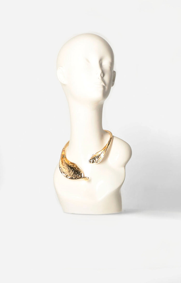 Este collar dorado destaca por su diseño estilo gargantilla con una sofisticada textura corrugada que aporta profundidad y elegancia. En cada extremo, se forman dos delicadas hojas que añaden un toque natural y distintivo, ideal para complementar tanto looks formales como casuales con un detalle único y refinado.