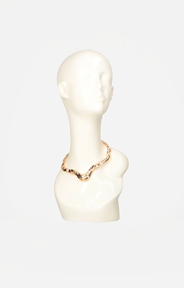 Este collar dorado presenta un diseño asimétrico con textura corrugada que aporta un toque moderno y sofisticado. Su ligereza lo hace cómodo para usar todo el día, ideal para complementar desde looks casuales hasta atuendos más formales con un estilo distintivo y elegante.
