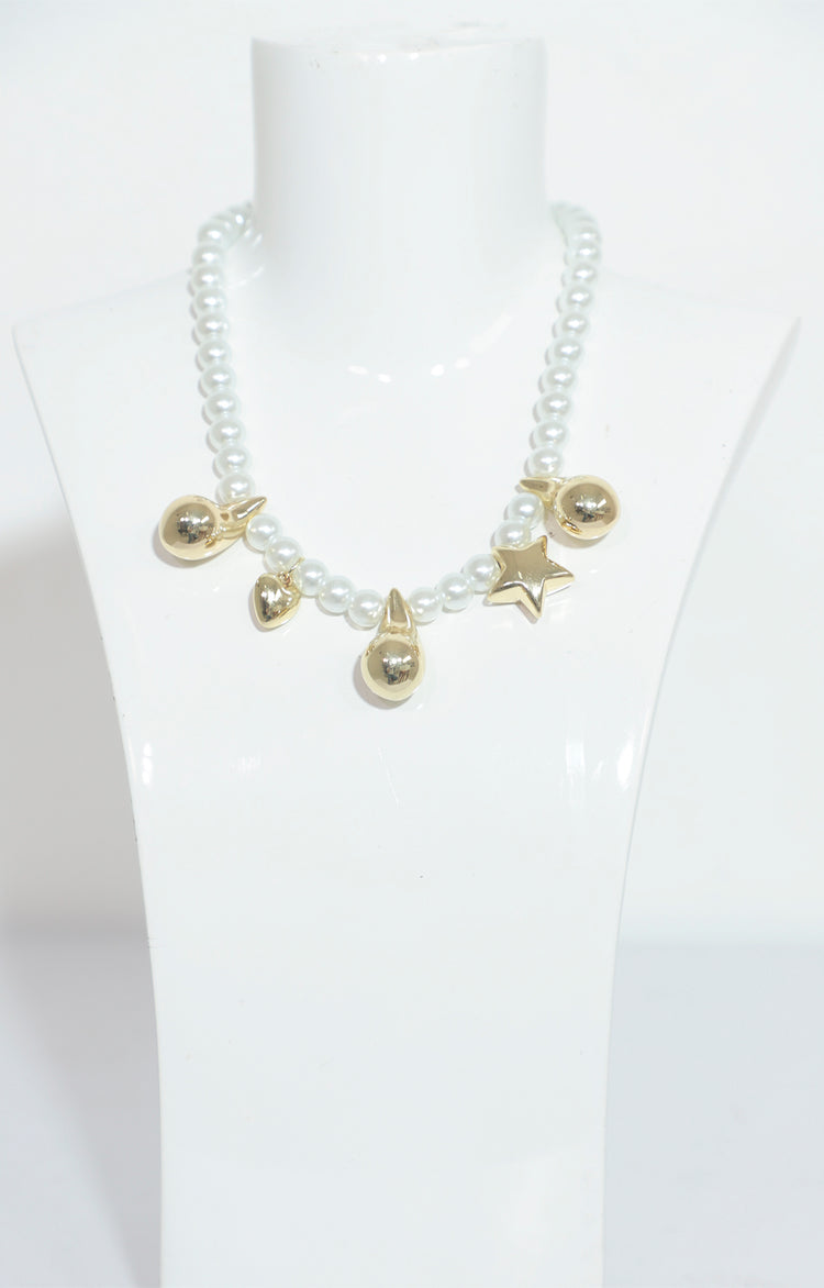 Este elegante collar de perlas es perfecto para cualquier ocasión. Los dijes dorados añaden un toque de brillo al clásico collar de perlas, lo que lo convierte en un accesorio versátil y sofisticado. Añade un toque de elegancia a tu atuendo con este hermoso collar de perlas con dijes dorados.
