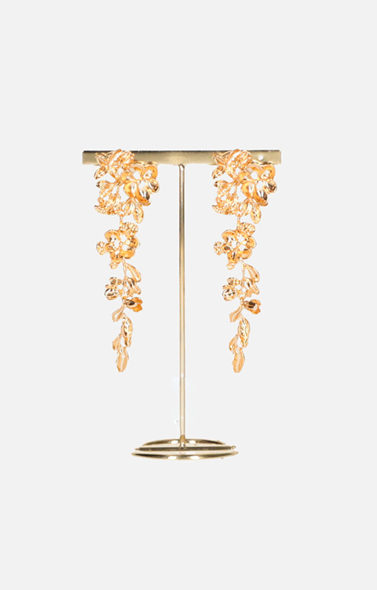 Estos aretes largos dorados destacan por su diseño elaborado en forma de flores, con una textura delicada que resalta cada detalle floral. Su estilo elegante y sofisticado los convierte en un complemento ideal para eventos y ocasiones especiales, aportando un toque de distinción y feminidad.