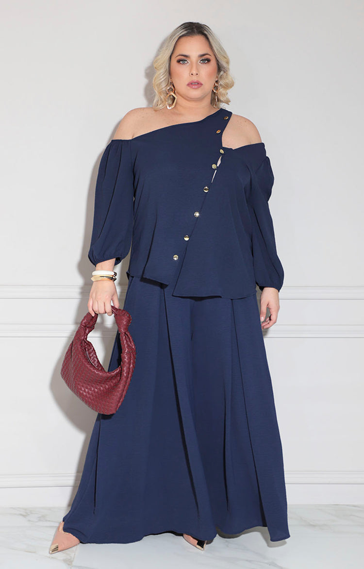 Blusa azul marino con tela suave que proporciona comodidad durante todo el día. Diseño asimétrico que añade movimiento y sofisticación a tu guardarropa, complementado por botones dorados sesgados que crean un detalle visual distintivo. Perfecta para transiciones de estación, esta pieza versátil se adapta tanto a looks casuales como a outfits más refinados. Una opción inteligente para quien busca prendas con carácter y calidad.