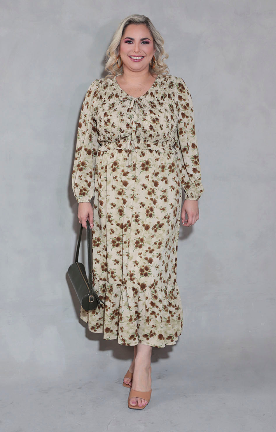 Este vestido verde estampado combina elegancia y comodidad gracias a su tela suave que se adapta al cuerpo. Cuenta con mangas largas ideales para cualquier estación y un resorte en la cintura que define la silueta y ofrece un ajuste cómodo. Su delicado estampado de flores añade un toque fresco y femenino, perfecto para ocasiones casuales o formales.