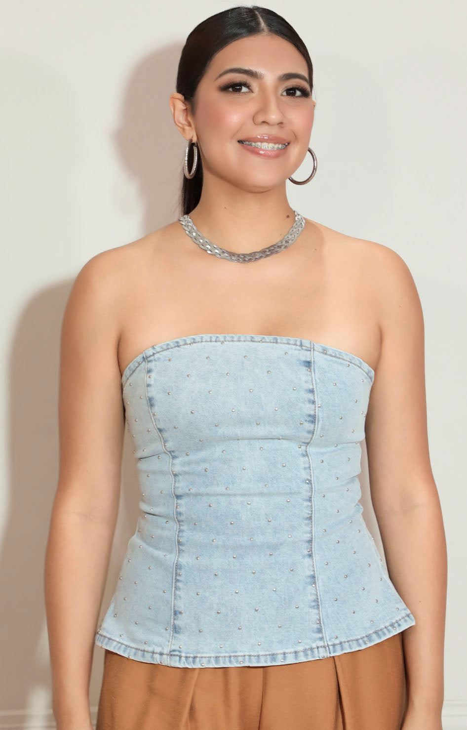 Esta blusa straple de mezclilla con brillos combina estilo y comodidad para cualquier ocasión. Su diseño sin tirantes resalta los hombros, mientras que los detalles brillantes añaden un toque de elegancia y modernidad. Perfecta para lucir fresca y a la moda, es una prenda versátil que realza tu confianza y personalidad.