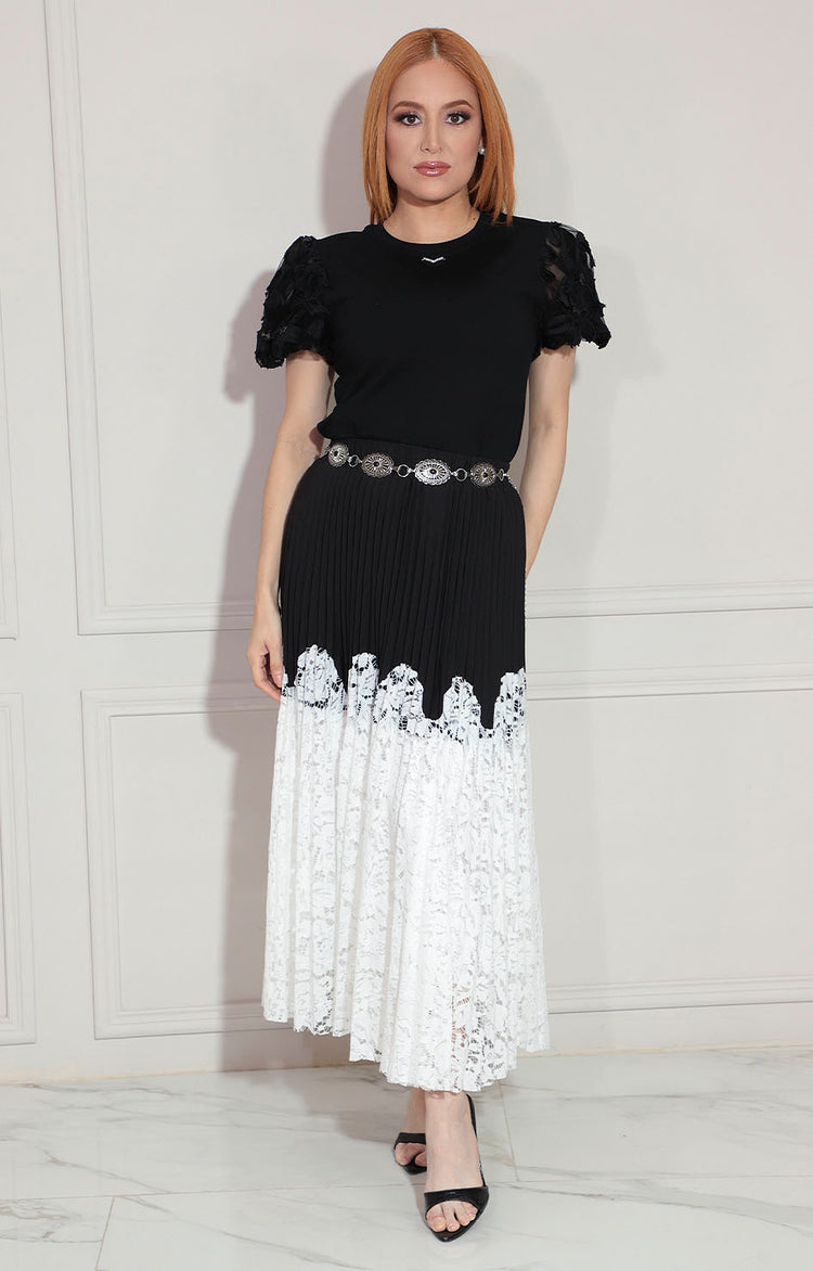 Esta blusa negra destaca por su delicada suavidad al tacto, combinando elegancia y comodidad. Su manga abullonada confeccionada en tul aporta volumen y un toque sofisticado, mientras que las flores en 3D realzan el diseño con detalle y textura. El cuello circular, adornado con una mini hebilla incrustada con piedras, añade un acabado refinado que la convierte en una prenda ideal para ocasiones especiales o para resaltar tu estilo con distinción.
