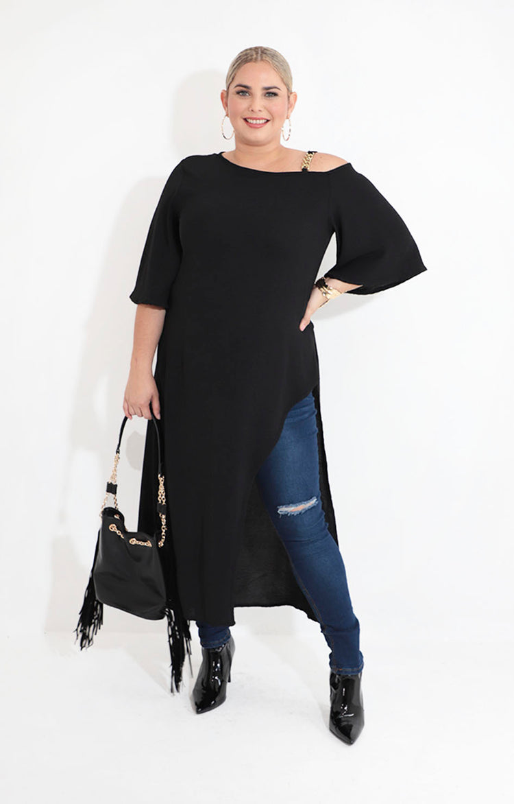 Este blusón negro destaca por su corte asimétrico que aporta un toque moderno y sofisticado. Su tirante delgado con herraje dorado ofrece un detalle elegante que realza el diseño, ideal para ocasiones especiales o un look refinado. La combinación de líneas limpias y acabados delicados garantiza comodidad y estilo en un solo complemento.