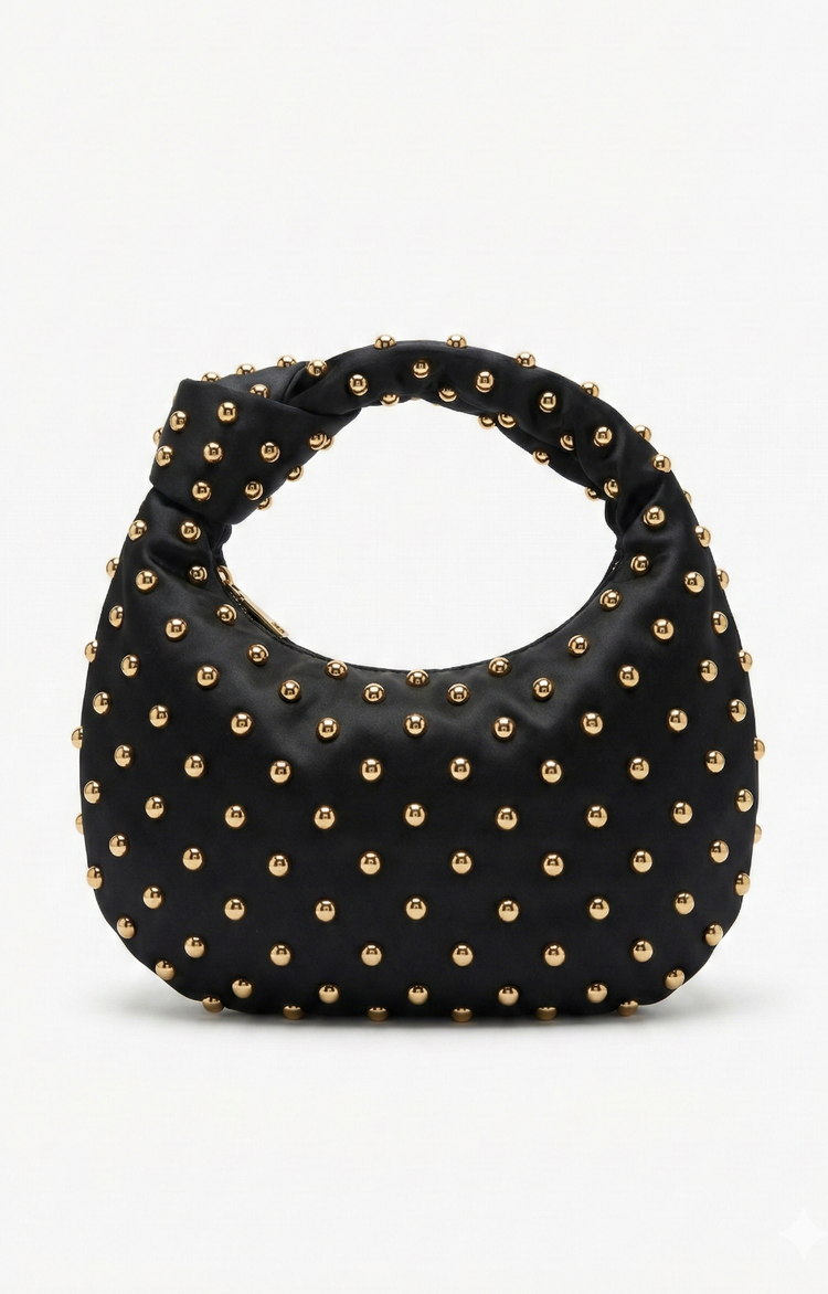 Bolsa negra confeccionada con materiales de calidad superior, adornada con estoperoles metálicos estratégicamente distribuidos que le otorgan un acabado sofisticado y contemporáneo. Su diseño versátil la convierte en la opción ideal para complementar tanto looks casuales como más formales. Los estoperoles añaden un toque de elegancia industrial sin comprometer la funcionalidad. Perfecta para quienes buscan una pieza de moda que combine estilo audaz con practicidad diaria.