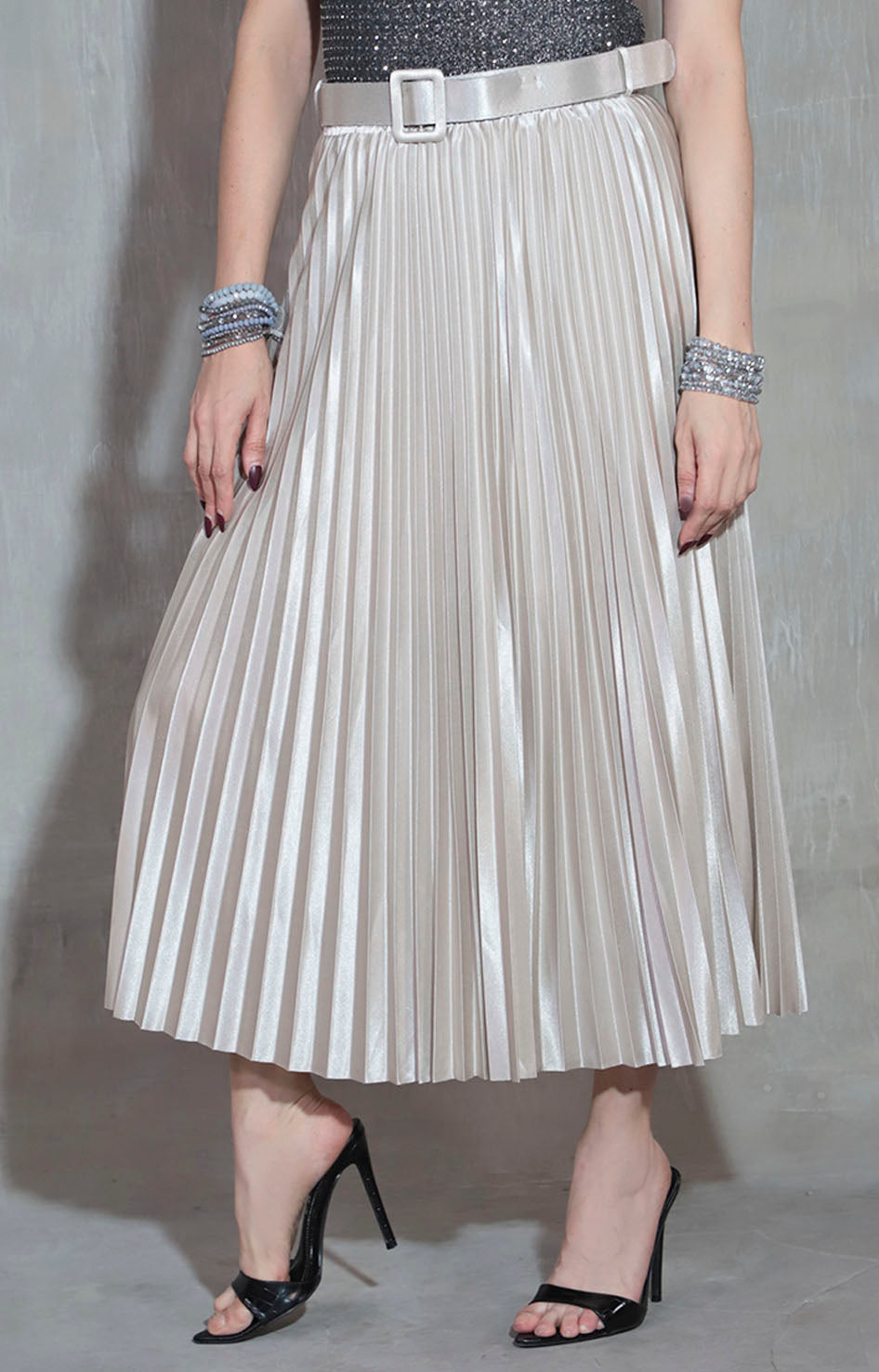 Esta falda beige metálica destaca por su textura plisada en toda la superficie, que aporta movimiento y sofisticación. Con un corte circular, ofrece una caída elegante y fluida que realza la silueta. Confeccionada en tela suave, garantiza comodidad durante todo el día. Incluye cinturón para ajustar y definir la cintura, combinando estilo y funcionalidad en una prenda versátil para cualquier ocasión.