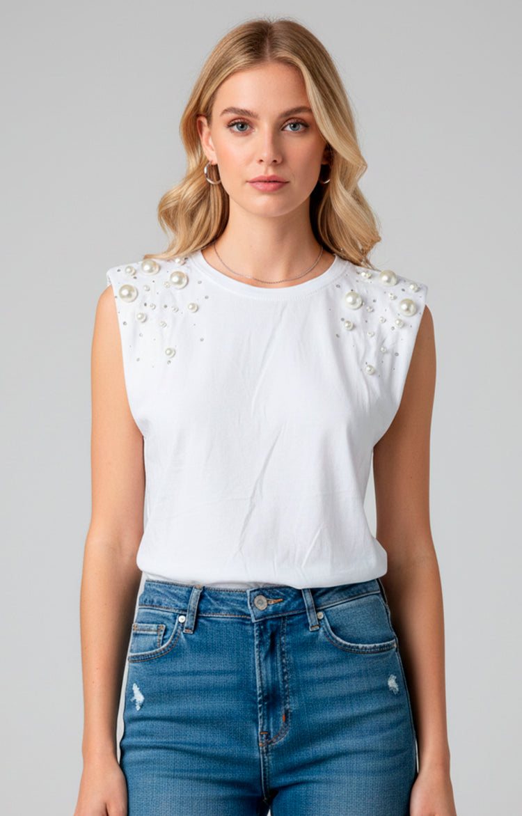 Blusa confeccionada en tela sisada de excelente calidad, realzada con delicados detalles de perlas que añaden sofisticación a tu look. Su cuello redondo clásico proporciona comodidad y versatilidad, permitiéndote combinarla fácilmente con diferentes prendas. Ideal para ocasiones especiales o para elevar tu estilo cotidiano con un toque elegante y refinado.
