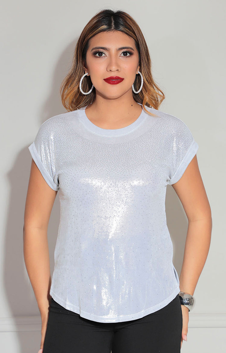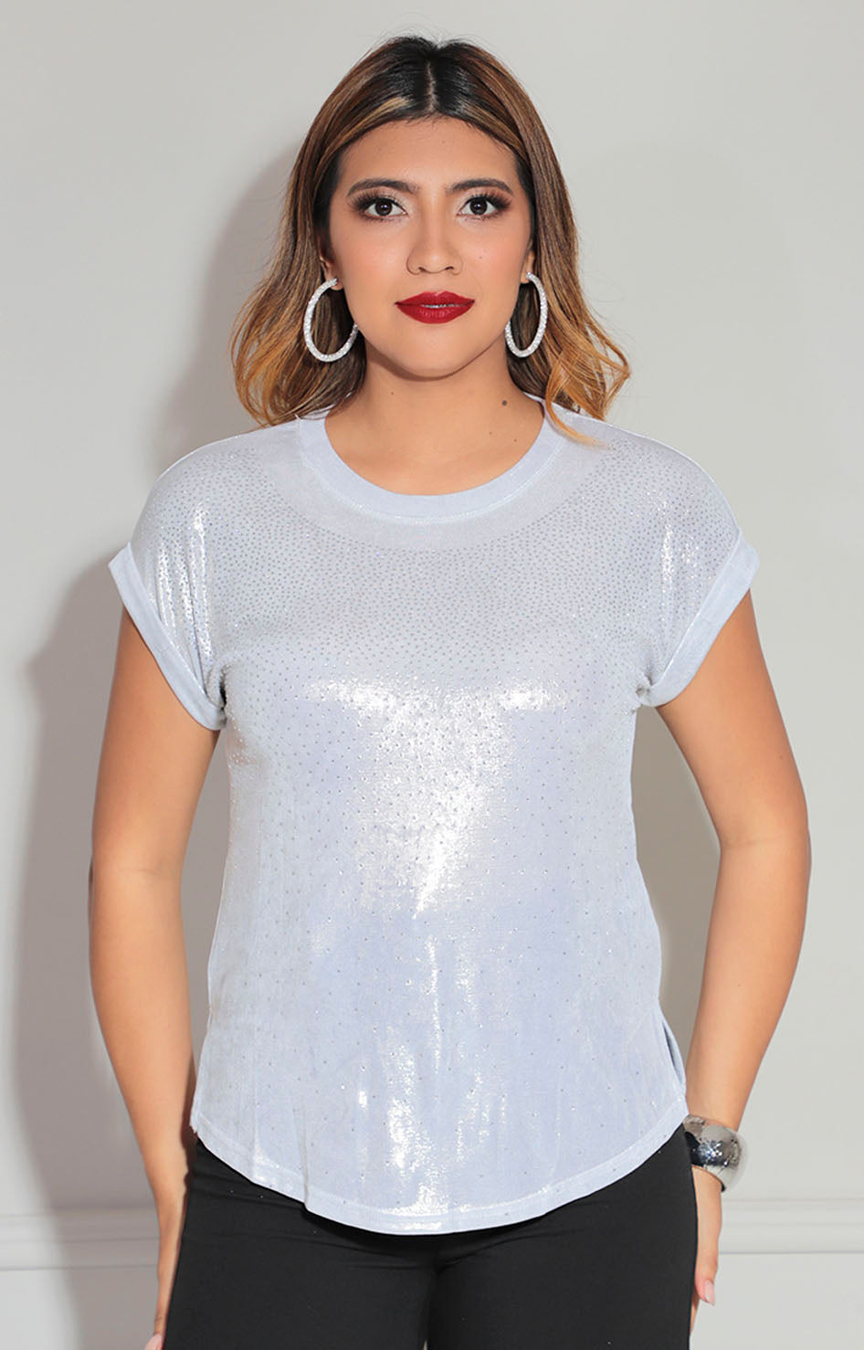 Blusa confeccionada en tela plateada de alta calidad que refleja luz elegantemente. Su diseño versátil se adapta tanto a ocasiones formales como a looks casuales sofisticados. La tela mantiene su brillo y forma tras múltiples lavados, garantizando durabilidad. Perfecta para crear outfits modernos que destacan por su luminosidad y refinamiento. Una pieza esencial que eleva cualquier guardarropa con su acabado metálico distinguido.