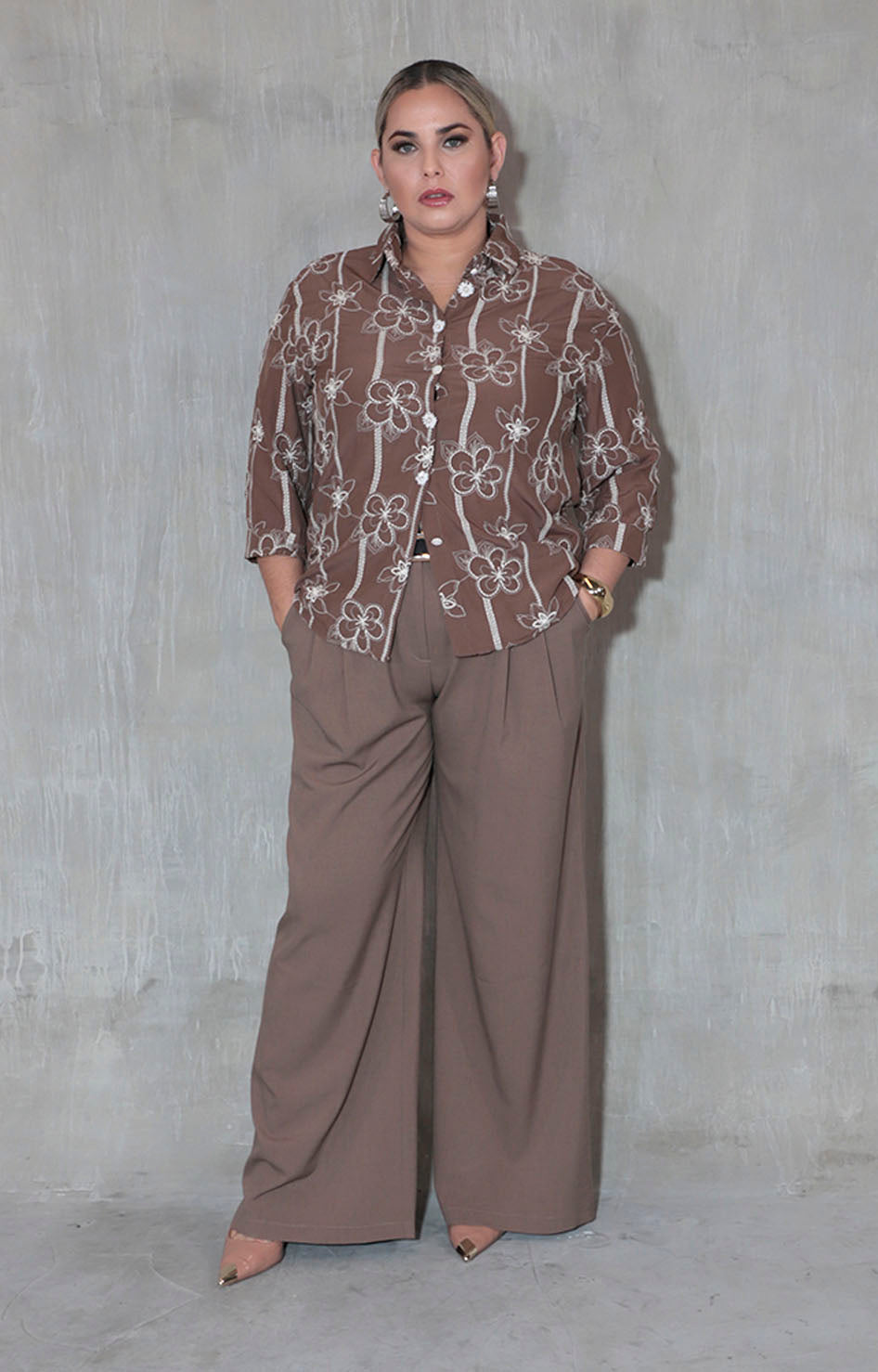 Esta camisera café destaca por su tela suave que garantiza comodidad durante todo el día. Su diseño de manga larga ofrece un toque elegante y práctico, ideal para diversas ocasiones. El estampado de flores en tono blanco aporta frescura y sofisticación, mientras que los botones con aplicaciones de pedrería, cuidadosamente colocados para formar flores, añaden un detalle delicado y exclusivo que realza el estilo de esta prenda. Perfecta para quienes buscan combinar confort con un diseño femenino y detallado.