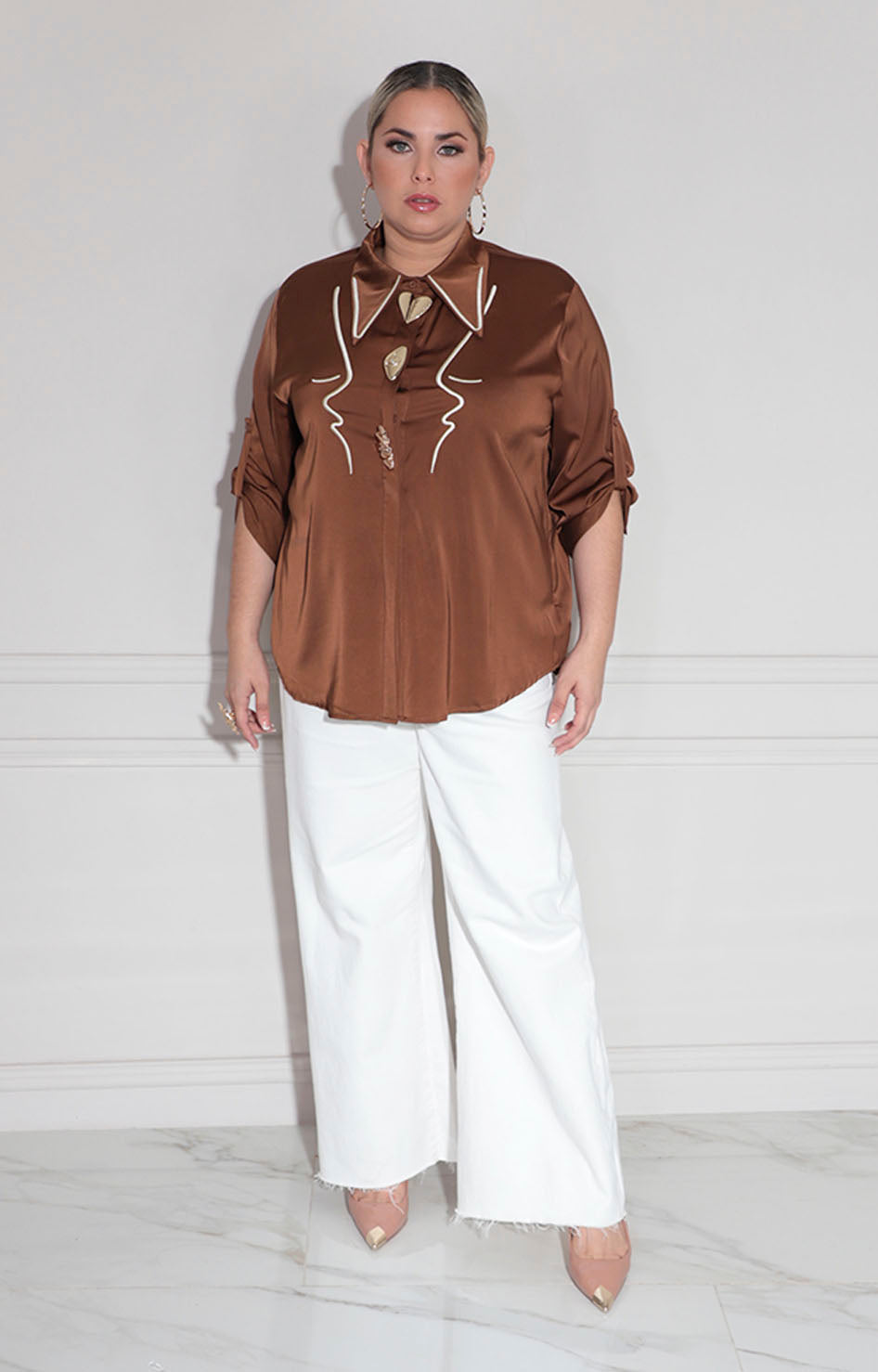 Camisera de satén café confeccionada en tela suave y fluida que proporciona comodidad y elegancia en cada uso. Destaca por su bordado artesanal al frente, que añade un toque de sofisticación y personalidad. Las mangas largas ofrecen versatilidad para diferentes ocasiones y climas, mientras que los botones dorados complementan perfectamente el diseño, creando un contraste refinado. Prenda versátil ideal para looks casuales elevados o eventos especiales.
