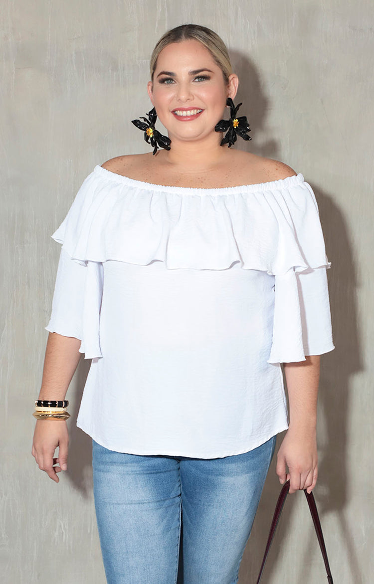 Esta blusa blanca destaca por su tela suave y agradable al tacto, diseñada para ofrecer comodidad durante todo el día. Su estilo off-shoulder resalta el cuello y los hombros, mientras que la manga 3/4 aporta un toque de elegancia y practicidad. El delicado olán en el escote añade un detalle femenino y sofisticado, haciendo de esta prenda una opción ideal para ocasiones casuales y formales.