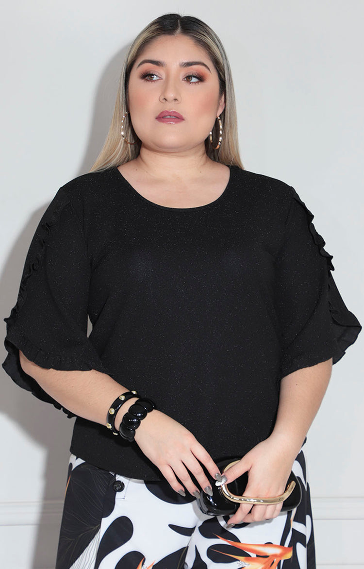 Blusa negra confeccionada en tela de calidad premium que ofrece comodidad y elegancia en cada uso. Destaca por sus mangas con detalle de olán, un toque femenino que añade movimiento y sofisticación al diseño. Perfecta para crear looks versátiles, desde propuestas casuales hasta más formales. Su corte clásico la convierte en una pieza esencial del guardarropa que combina con cualquier estilo personal.