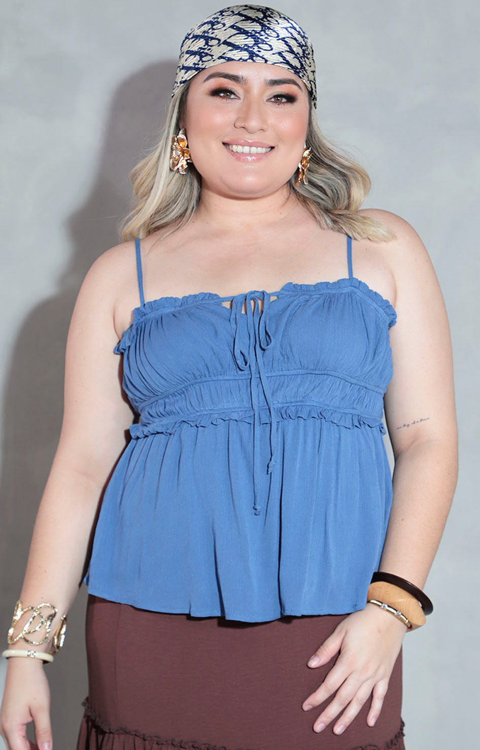 Esta blusa azul está confeccionada en una tela suave que garantiza comodidad durante todo el día. Sus tirantes delgados aportan un toque delicado y elegante, mientras que el detalle de peplum en la zona inferior realza la silueta, ofreciendo un ajuste femenino y sofisticado ideal para diversas ocasiones.