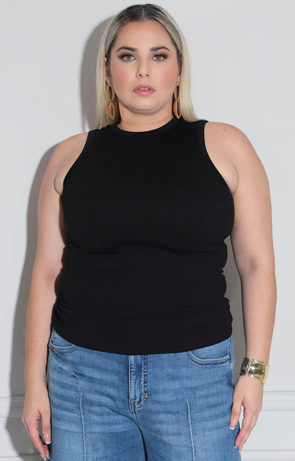 Blusa negra básica confeccionada en tela suave y elástica que se adapta perfectamente a tu silueta. Diseño versátil con cuello circular y sisada, ideal para crear looks tanto casuales como profesionales. Su composición permite movimiento cómodo sin perder la forma, convirtiéndola en una pieza esencial del guardarropa que combina con cualquier estilo.
