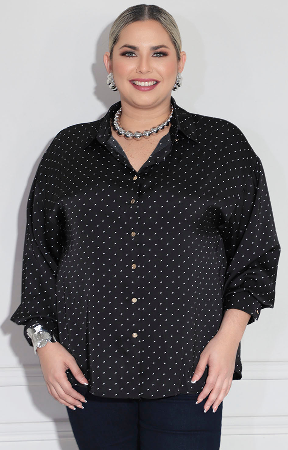 Camisera de tela suave en tono negro con elegantes lunares. Diseño clásico con manga larga que proporciona cobertura versátil y botones al frente para un cierre práctico y ajustable. Perfecta para crear looks sofisticados tanto en contextos casuales como profesionales. Su textura delicada garantiza confort durante todo el día.