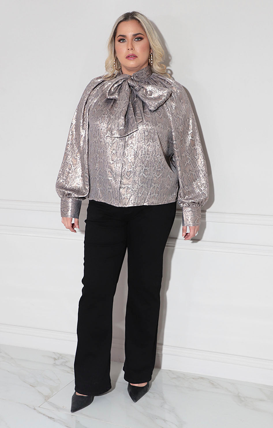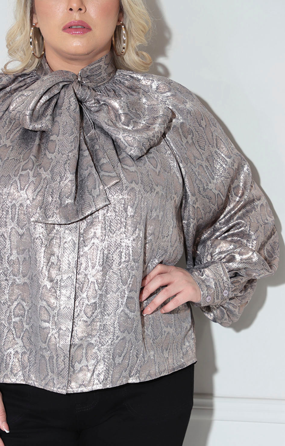 Blusa de manga larga en beige metálico con un toque sofisticado. Presenta un elegante lazo en el cuello que añade movimiento y feminidad al diseño. El estampado de guepardo aporta un patrón animal print clásico y versátil. Cierre frontal con botones funcionales que facilitan el uso diario. Perfecta para crear looks modernos tanto en contextos casuales como profesionales.