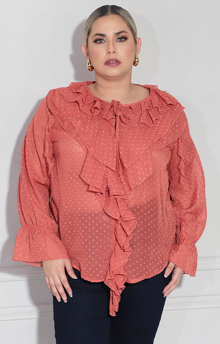 Blusa confeccionada en tela suave y texturizada con patrón chedrón que añade dimensión visual a tu guardarropa. Diseño de manga larga que proporciona cobertura versátil, complementado con un elegante olán al frente que genera movimiento y sofisticación. Cuello circular clásico que favorece múltiples tipos de rostro. Pieza versátil ideal para transiciones de estación, combinable tanto con prendas casuales como formales.