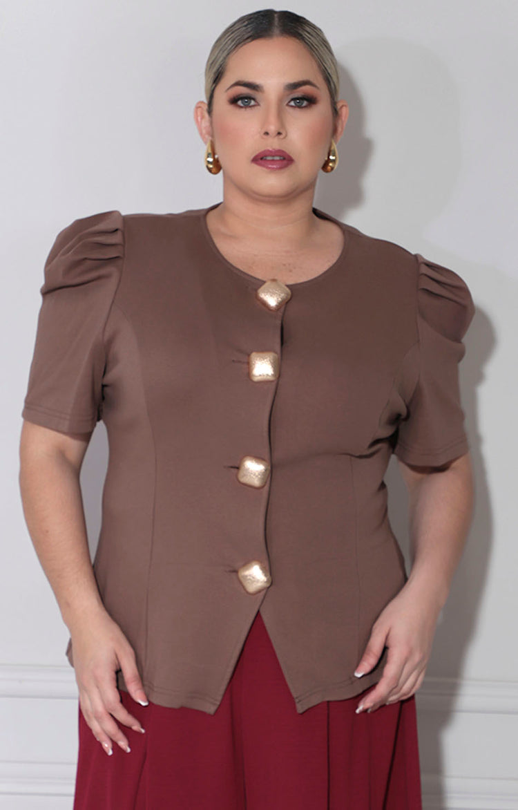 Blusa café confeccionada en tela suave que proporciona comodidad durante todo el día. Destaca por sus mangas estilo farol que añaden movimiento y elegancia a tu silueta. El cuello circular ofrece un acabado clásico y versátil, mientras que los botones cuadrados dorados aportan un detalle sofisticado que eleva el diseño. Pieza versátil ideal para crear looks casuales o semi-formales con facilidad.