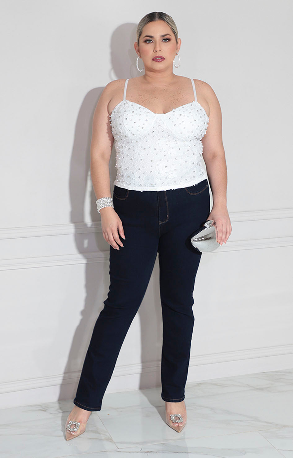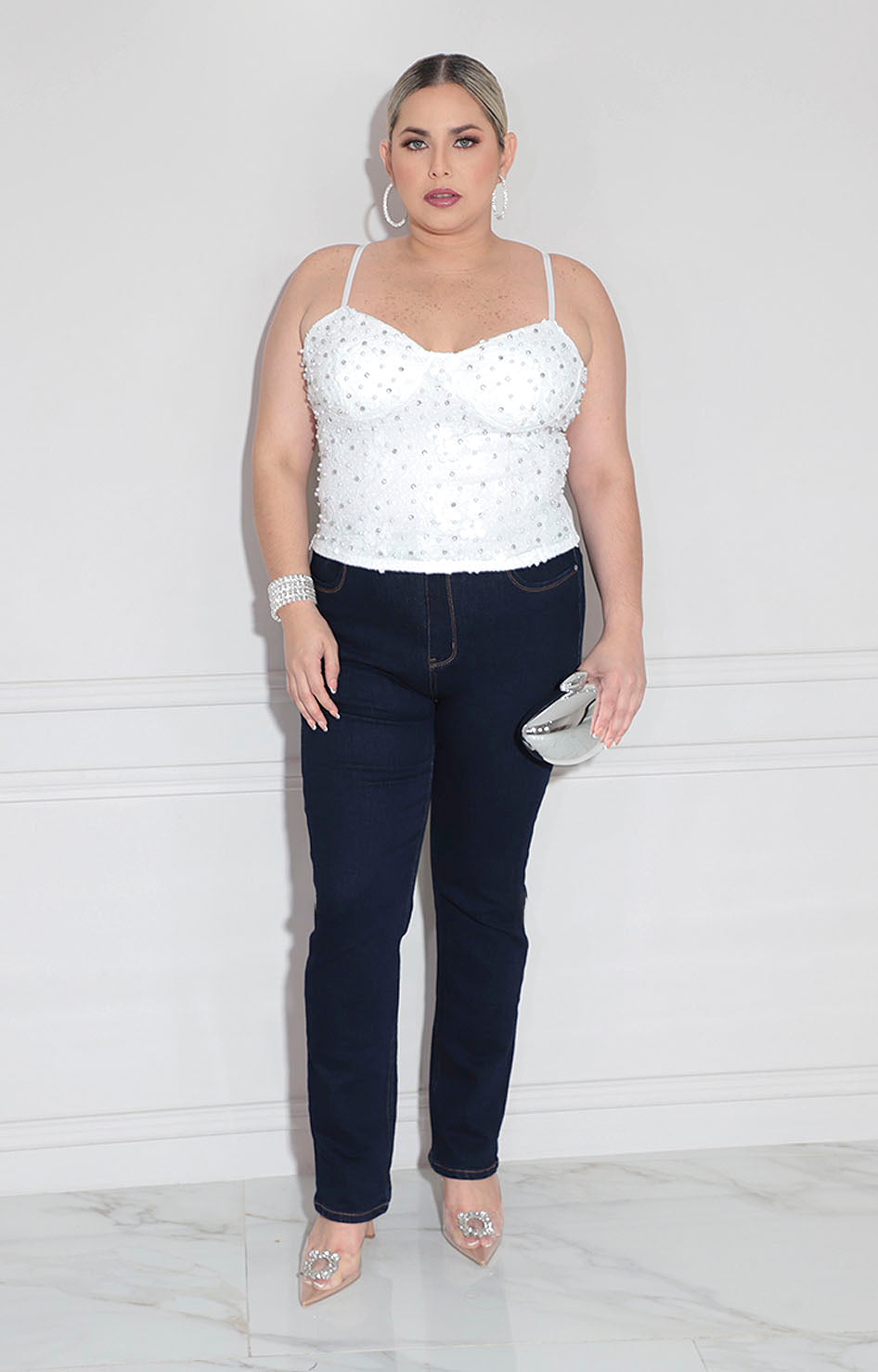 Blusa blanca confeccionada en tela suave que proporciona comodidad durante todo el día. Diseño elegante con tirantes delgados que crean una silueta refinada y moderna. Toda la prenda está cubierta con aplicaciones de brillos que capturan la luz, perfecta para ocasiones especiales o para añadir un toque glamoroso a tu look cotidiano. Cierre funcional en la espalda que facilita el ajuste y garantiza un calce impecable.