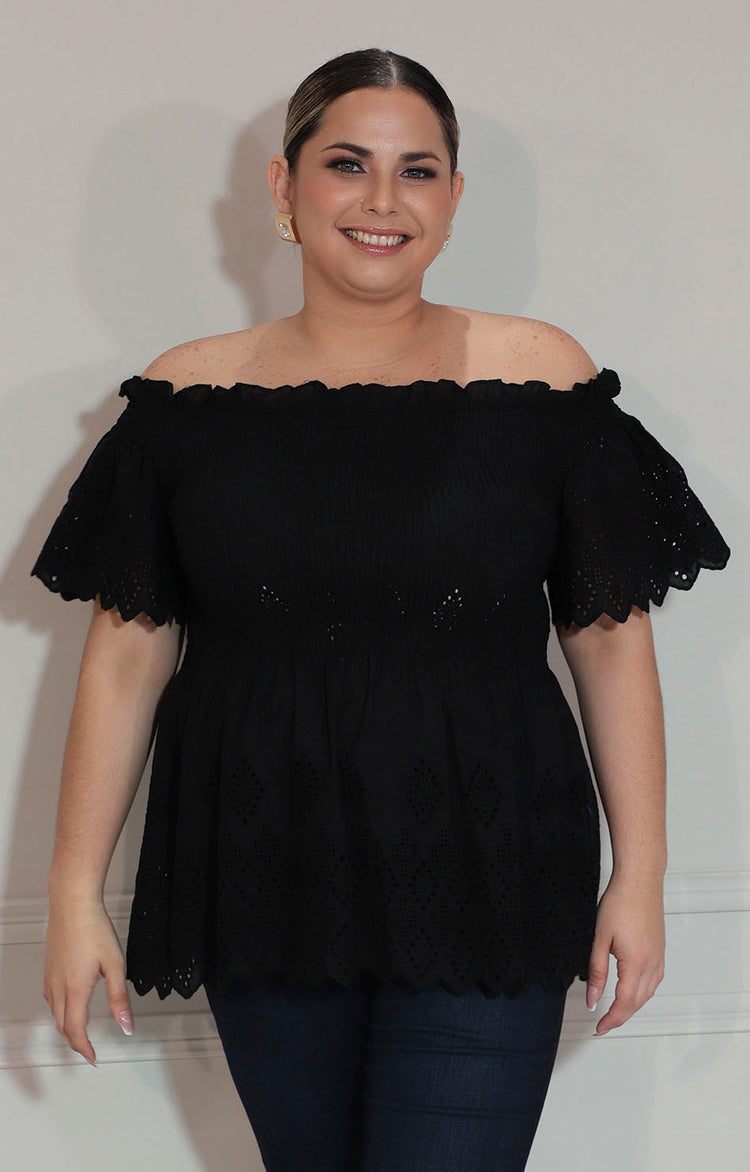 Suave al tacto, fruncido elástico en zona superior. Manga y peplum en tela de tira bordada.