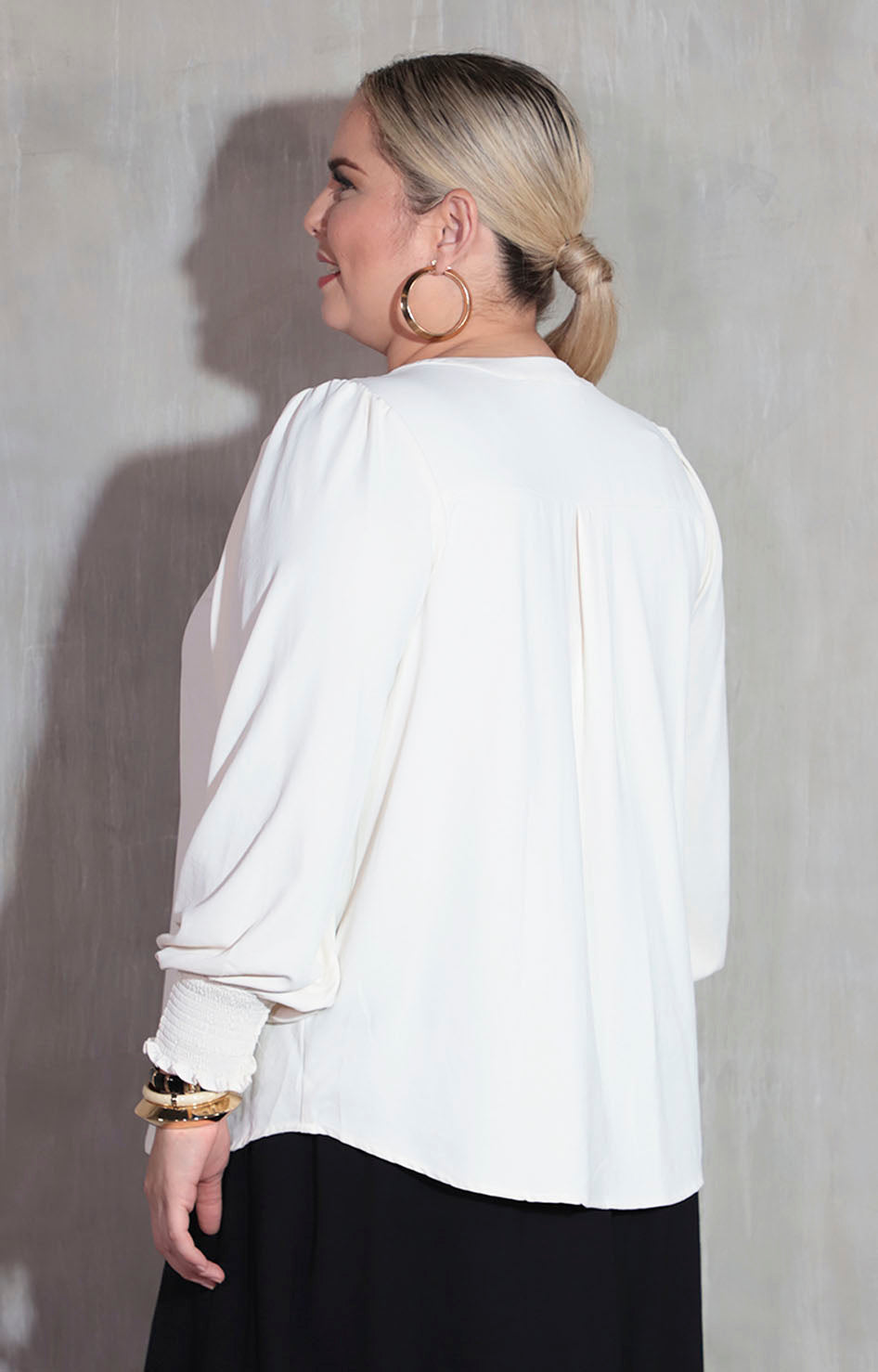 Blusa beige confeccionada en tela suave que proporciona comodidad durante todo el día. Diseño elegante con manga larga y detalle de lazo en el cuello que añade un toque sofisticado a tu look. Los puños cuentan con fruncido elástico que se ajusta perfectamente a tu muñeca, garantizando un acabado pulido y profesional. Ideal para crear outfits versátiles tanto en contextos casuales como más formales.