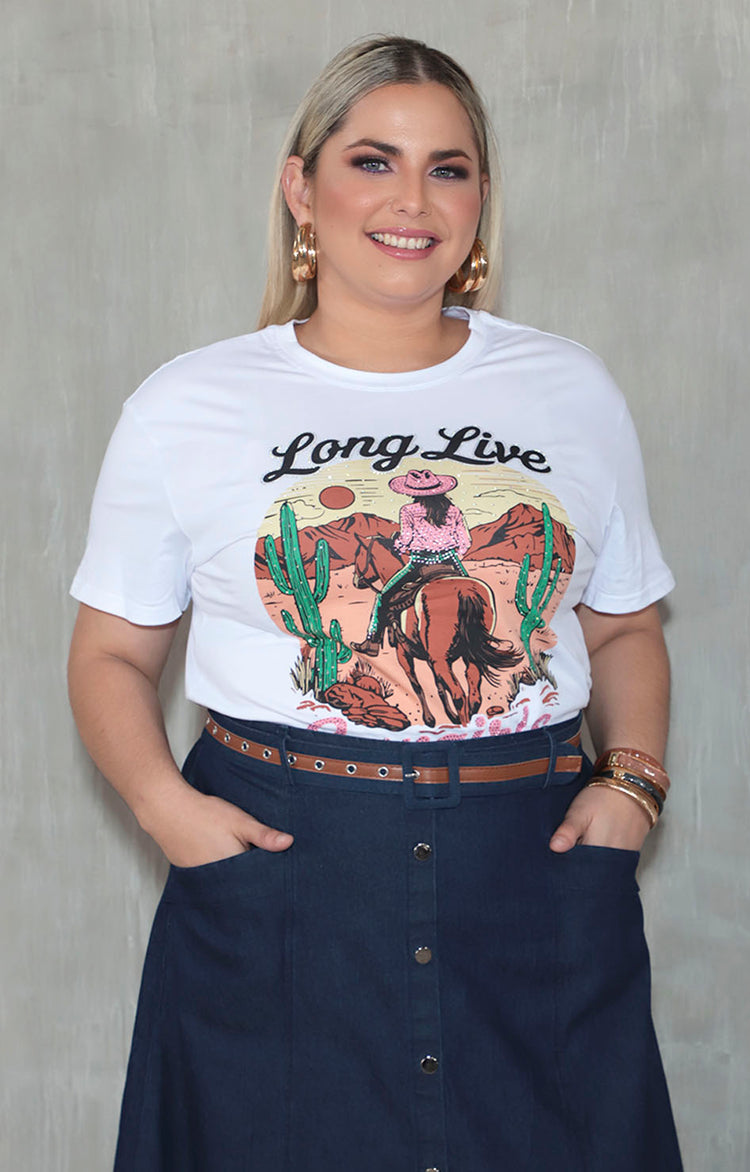 Blusa blanca de tela suave con manga corta y cuello circular. Presenta un distintivo estampado de estilo rodeo al frente que le añade carácter y personalidad. Perfecta para crear looks casuales versátiles, esta pieza combina comodidad y estilo en una prenda esencial para tu guardarropa. Ideal para usar sola o como base para capas adicionales.