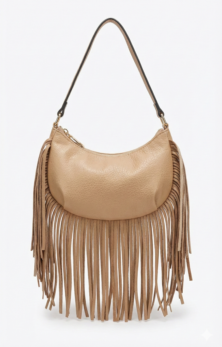 Bolsa de diseño versátil en tonalidad beige neutro, adornada con flecos que añaden movimiento y textura a tu look. Confeccionada con materiales de calidad, esta pieza combina elegancia clásica con un toque bohemio contemporáneo. Perfecta para complementar tanto outfits casuales como más sofisticados, su tamaño funcional permite llevar tus esenciales sin comprometer el estilo. Los flecos colgantes generan un efecto dinámico que captura la atención, mientras que el color beige se adapta a cualquier paleta de vestuario. Una inversión en accesorio que trasciende tendencias.