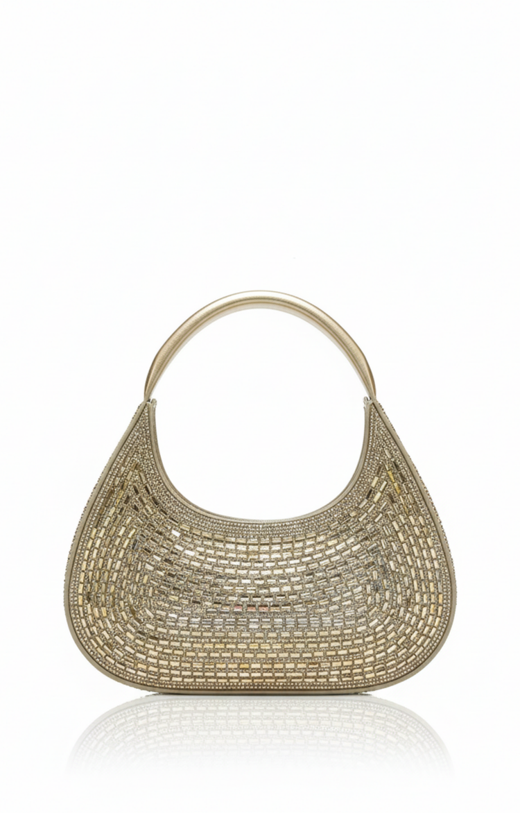 Bolsa pequeña confeccionada en tonalidad dorada con detalles de pedrería que añaden brillo y elegancia. Su tamaño compacto la hace ideal para ocasiones especiales, permitiendo llevar lo esencial con estilo. Los cristales incrustados capturan la luz, creando un efecto luminoso que complementa cualquier atuendo formal o de gala. Perfecta para eventos nocturnos, cenas o celebraciones donde se busca un accesorio sofisticado y versátil.