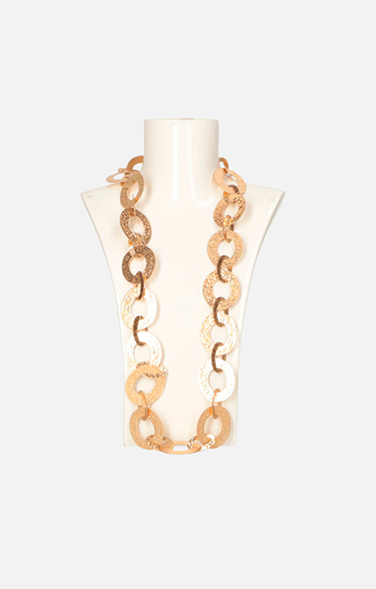 Este collar largo dorado destaca por sus eslabones texturizados que aportan un acabado sofisticado y un tono brillante que realza cualquier atuendo. Ideal para quienes buscan un accesorio elegante que combine con múltiples estilos, su diseño favorece la versatilidad y un toque de distinción. Perfecto para añadir luminosidad y elegancia a tu look diario o eventos especiales.
