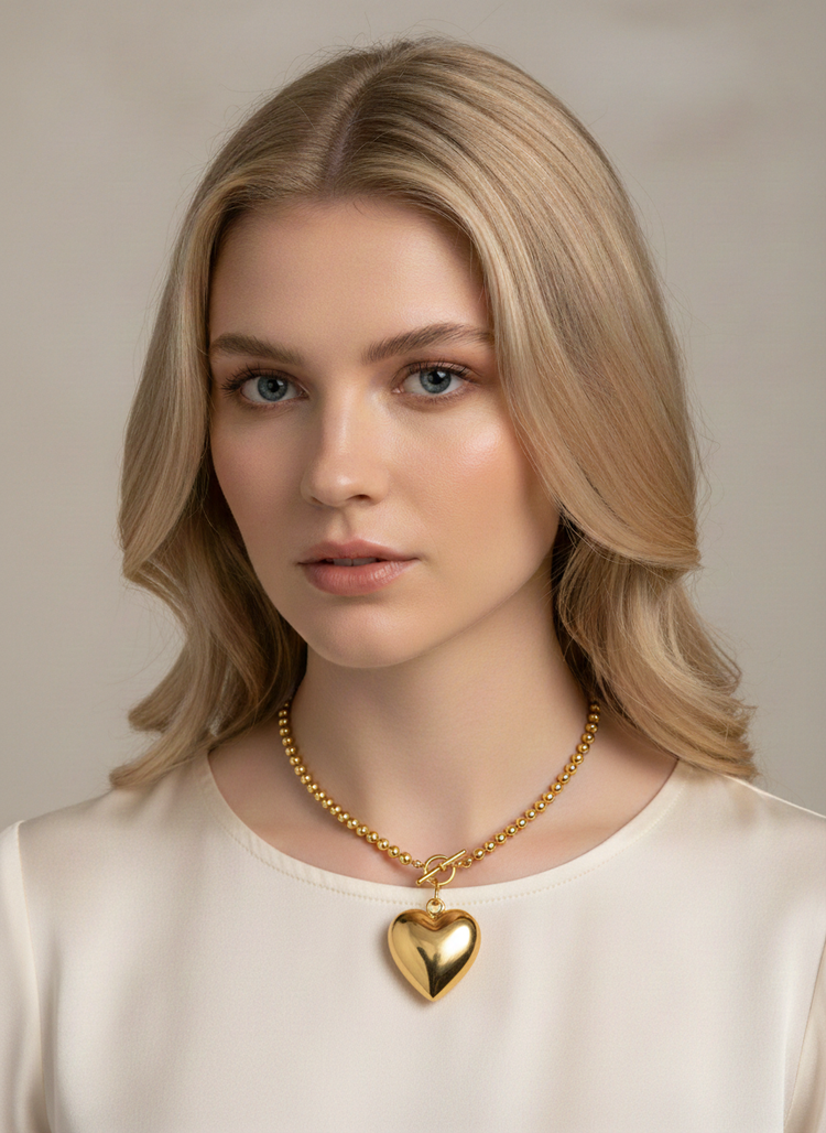 Collar elegante confeccionado con perlas doradas de brillo cautivador, complementado con un delicado corazón que añade un toque romántico y sofisticado. Cada pieza ha sido seleccionada cuidadosamente para garantizar calidad y durabilidad. Ideal para ocasiones especiales o para realzar tu estilo cotidiano con un accesorio versátil que combina feminidad y distinción. Un regalo perfecto que transmite elegancia y sentimiento.