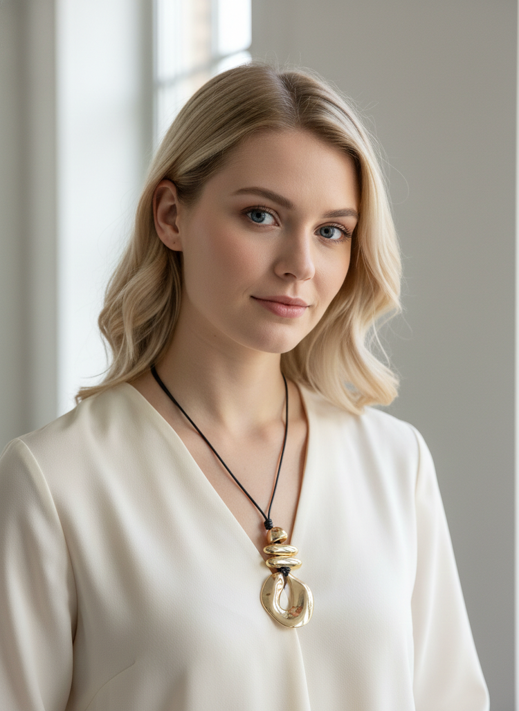Collar extenso en tonalidad negra que destaca por su maxi dije de presencia imponente. Pieza versátil que combina elegancia minimalista con un toque de sofisticación, ideal para complementar tanto looks casuales como formales. Su largo generoso permite múltiples formas de uso, adaptándose a diferentes estilos personales. El dije de gran formato actúa como punto focal, elevando cualquier conjunto con un acento de distinción y carácter.