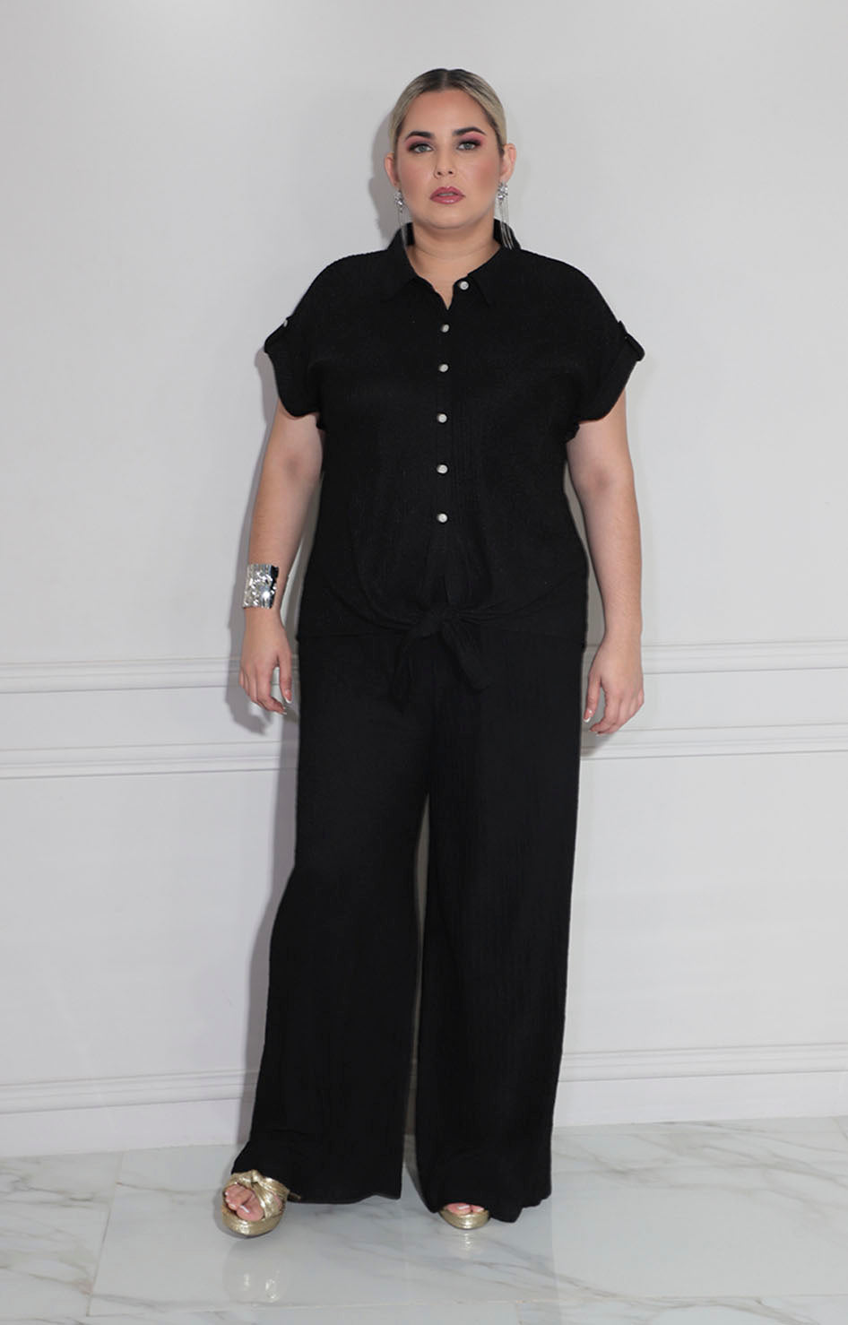 Conjunto elegante en negro compuesto por pantalón y blusa de botones. La blusa presenta un cierre frontal de botones que permite un ajuste personalizado y versatilidad en el uso, mientras que el pantalón ofrece un corte clásico que favorece la silueta. Esta combinación es ideal para crear looks sofisticados tanto en contextos profesionales como en ocasiones casuales. El negro es una tonalidad atemporal que se adapta a cualquier estación y combina fácilmente con accesorios diversos, garantizando múltiples posibilidades de estilismo.