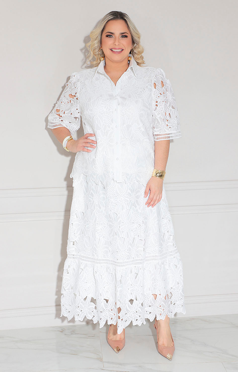Conjunto elegante confeccionado en guipiur blanco que combina sofisticación y comodidad. Diseñado con botones frontales funcionales que facilitan el ajuste perfecto, complementado por una falda larga que proporciona movimiento fluido y una silueta alargada. La textura delicada del guipiur añade profundidad visual y un toque de refinamiento a tu guardarropa. Ideal para ocasiones especiales, eventos formales o para quienes buscan prendas versátiles que transiten entre el día y la noche con elegancia natural.