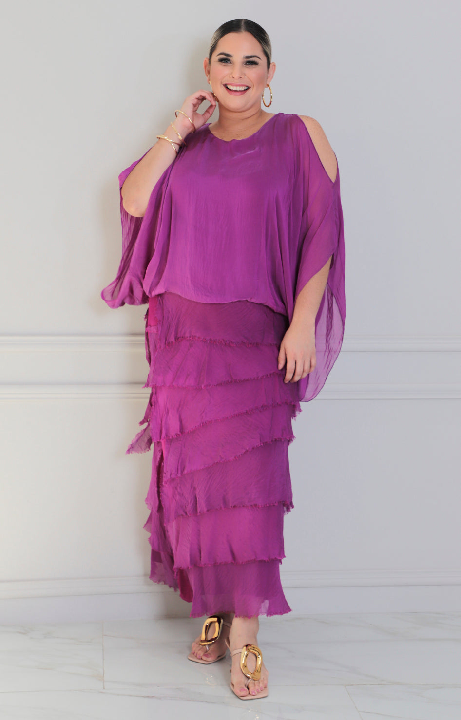 Conjunto magenta confeccionado en tela fluida que realza la silueta con volantes estratégicamente distribuidos. Diseño de manga mariposa que proporciona comodidad y movimiento, complementado con cuello redondo clásico que favorece distintos tipos de rostro. Prenda versátil ideal para ocasiones casuales o semi-formales, combinable con accesorios minimalistas o llamativos según tu estilo personal. Confección de calidad que mantiene su forma tras múltiples lavados.