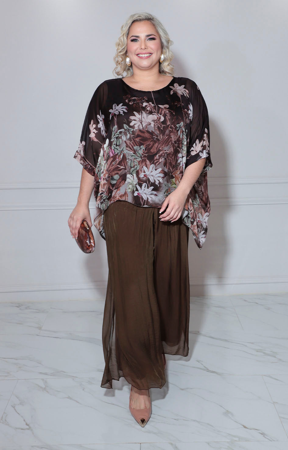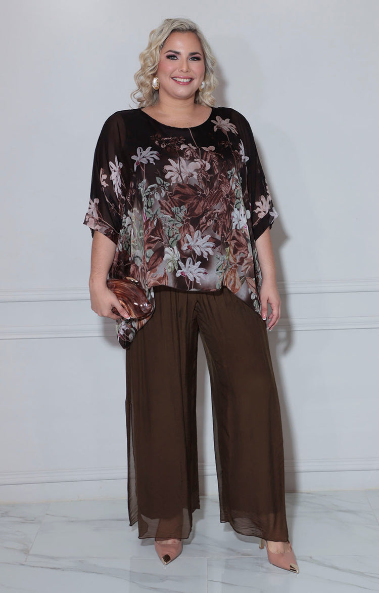 Este conjunto café con flores destaca por su suavidad al tacto gracias a la tela de seda que le aporta un acabado delicado y ligero. El pantalón recto, confeccionado con la misma tela, asegura una caída elegante y cómoda, ideal para prolongar el confort durante todo el día sin perder estilo. Perfecto para quienes buscan combinar sofisticación con sensación de ligereza.