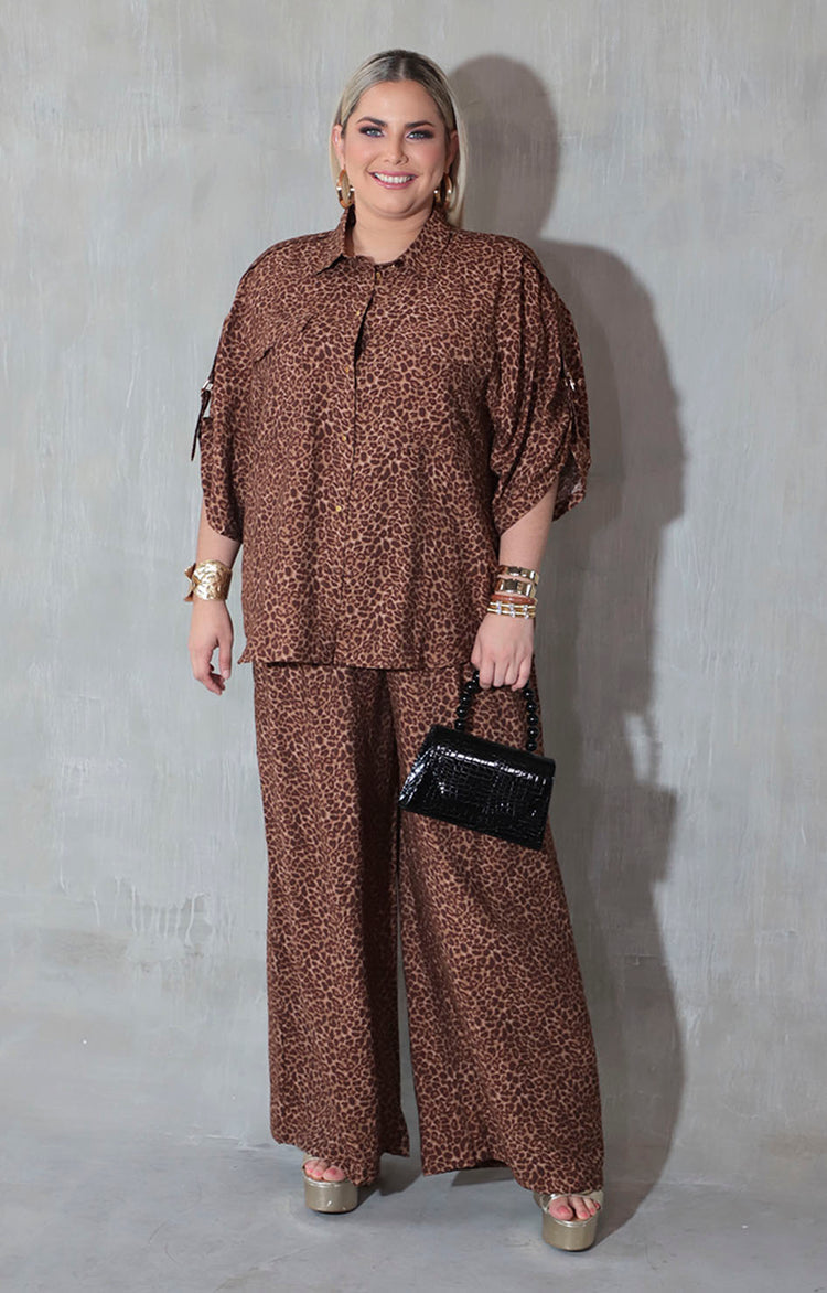 Conjunto café estampado que combina elegancia y comodidad. La blusa tipo camisera confeccionada en tela suave se adapta perfectamente a tu silueta, mientras que el pantalón recto de corte clásico proporciona una línea limpia y favorecedora. El distintivo estampado de cheetah añade un toque de sofisticación animal print a tu guardarropa. Ideal para transiciones de día a noche con versatilidad garantizada.