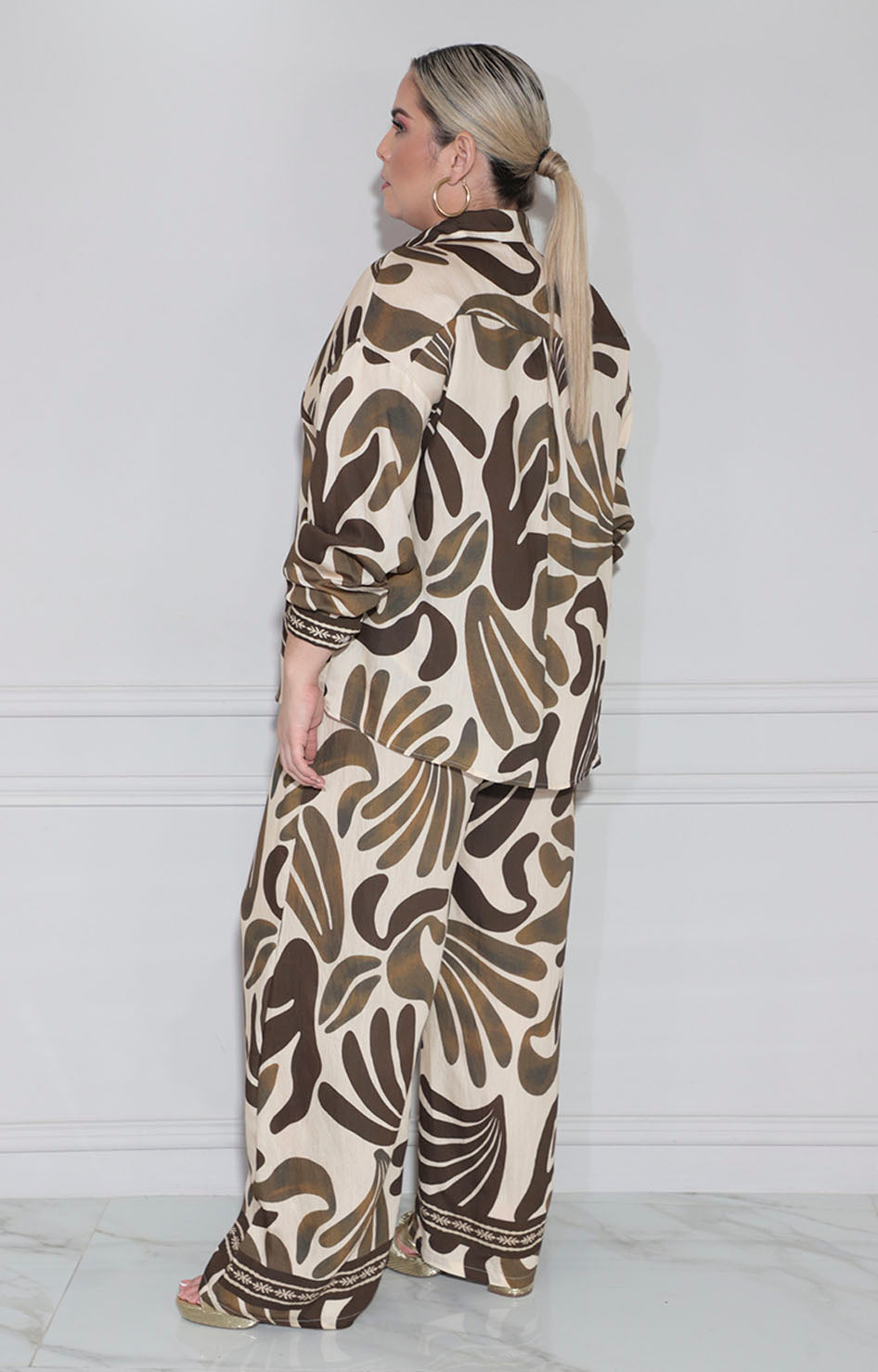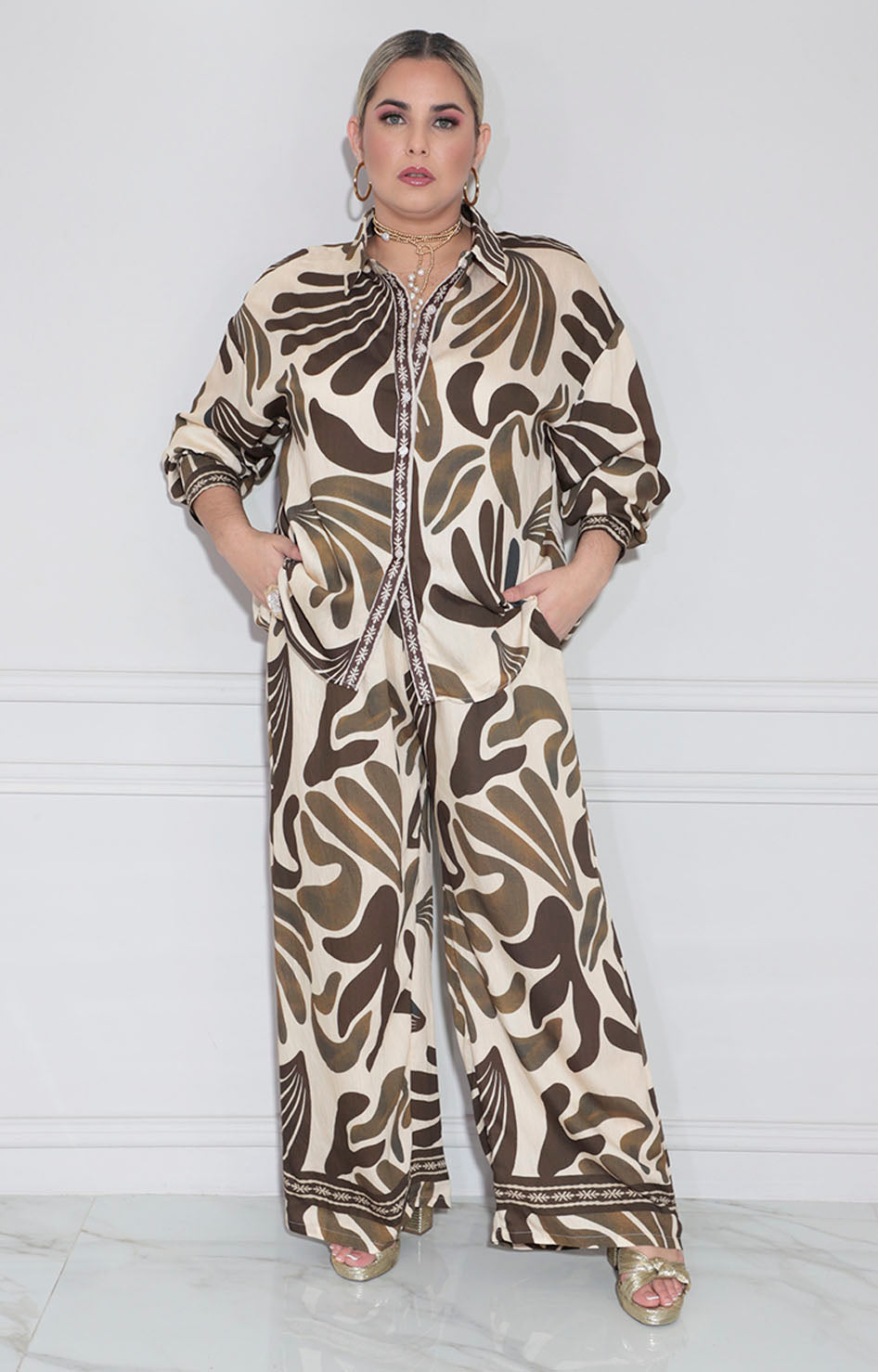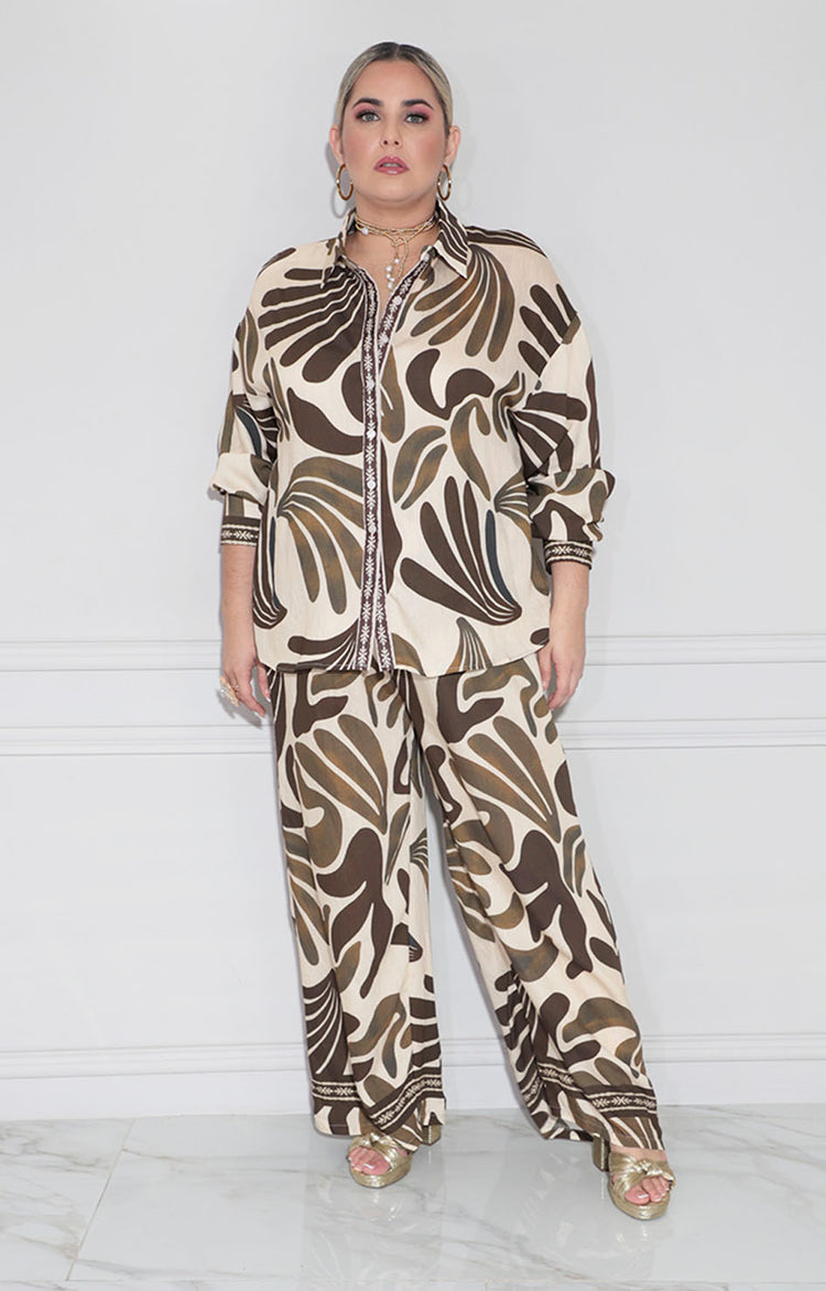 Conjunto beige floral confeccionado en tela suave que proporciona comodidad durante todo el día. La blusa estilo camisera con manga larga ofrece versatilidad para diferentes ocasiones, mientras que el pantalón recto con bolsillos laterales combina funcionalidad y elegancia. Perfecto para crear un look sofisticado y pulido que transita sin esfuerzo de la oficina a eventos casuales.