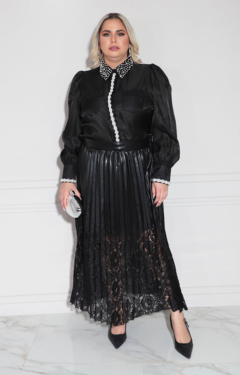 Falda negra plisada confeccionada con encaje delicado que añade sofisticación a tu guardarropa. El diseño de pliegues proporciona movimiento elegante y una silueta favorecedora. Perfecta para ocasiones formales o para elevar tu look cotidiano con un toque de refinamiento. La combinación de tela plisada con detalles de encaje crea una prenda versátil que transita sin esfuerzo entre diferentes estilos y eventos.