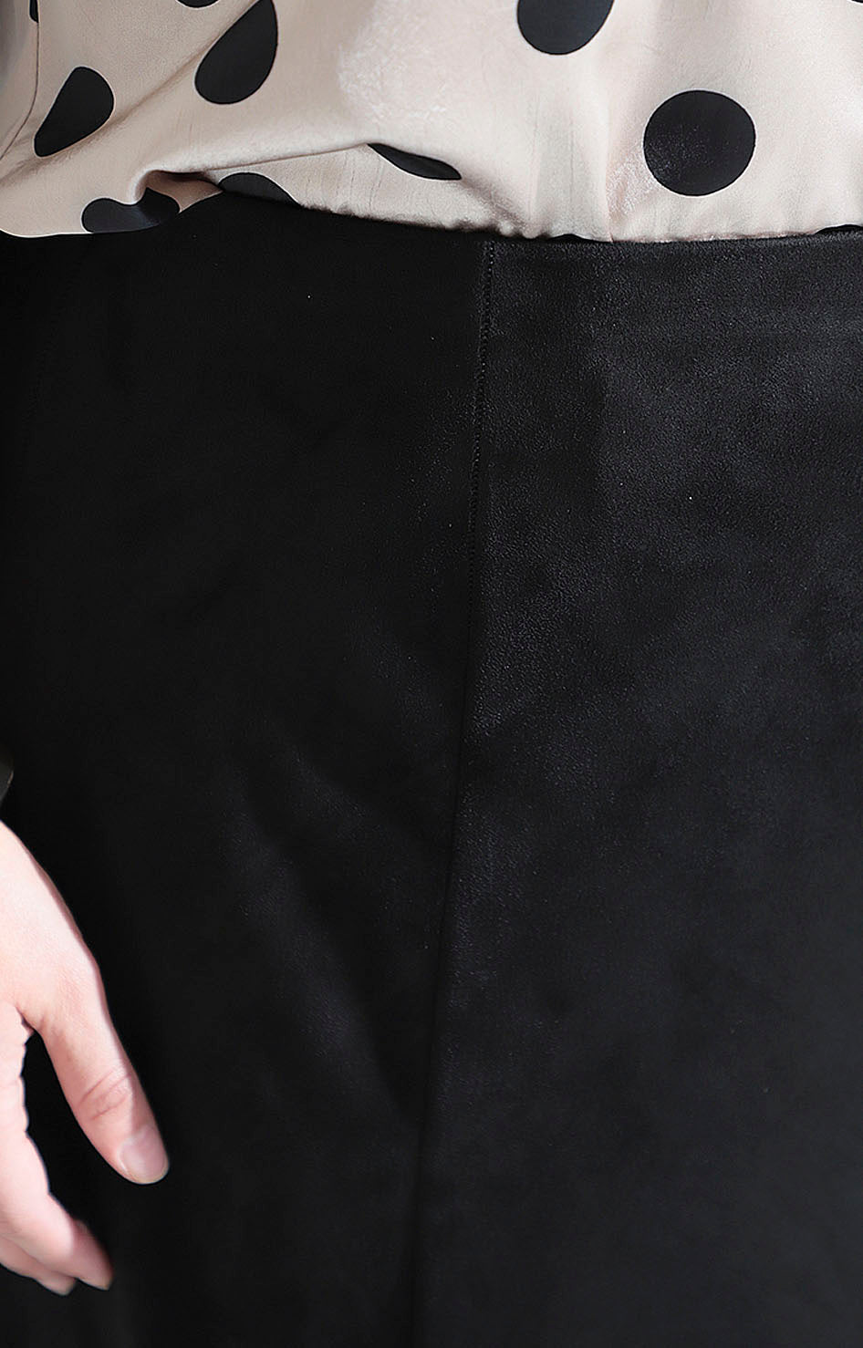 Falda negra confeccionada en gamuza suave que ofrece una textura delicada y confortable al tacto. Su corte recto proporciona una silueta elegante y versátil, ideal para crear looks sofisticados tanto en contextos formales como casuales. Cuenta con cierre funcional en la zona trasera que garantiza un ajuste seguro y preciso. Una pieza esencial que combina calidad de materiales con diseño atemporal.