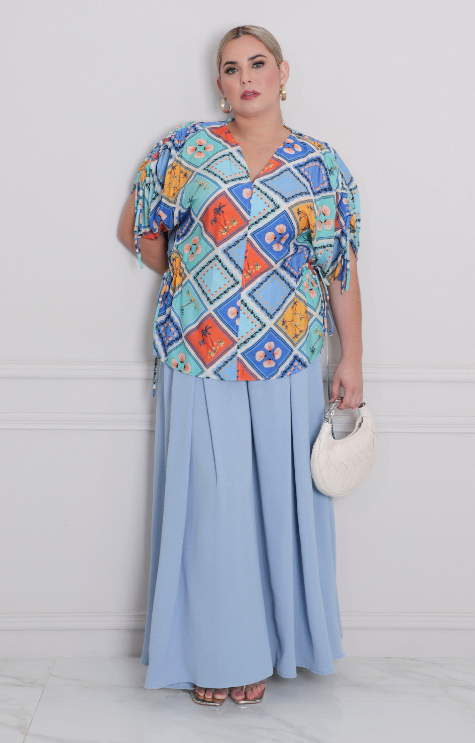 Blusa estampada con cuello en V que favorece cualquier tipo de figura. Cuenta con jareta en las mangas. Perfecta para combinar con jeans o faldas, esta pieza versátil es ideal para el día a día. Tela cómoda y fresca que te acompañará en cualquier ocasión.