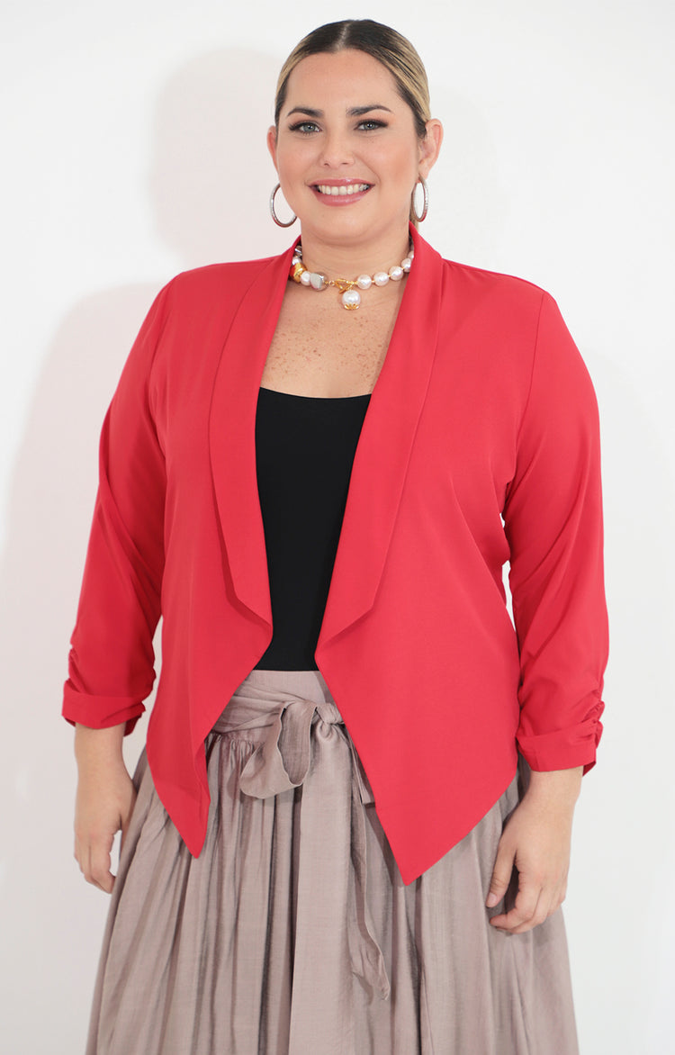 Elegante saco rojo que destaca por su detalle corrugado en las mangas, añadiendo un toque de textura y sofisticación a tu outfit. Perfecto para ocasiones especiales o para elevar tu look diario con un elemento distintivo y moderno.