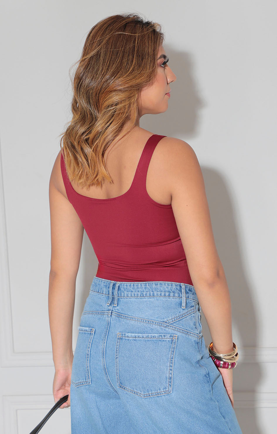 Blusa básica confeccionada en tela suave y elástica que se adapta perfectamente al cuerpo. Destaca por su elegante cuello cuadrado que enmarca el escote con sofisticación, complementado con tirantes medios que proporcionan comodidad y soporte. El tono vino profundo añade versatilidad a tu guardarropa, permitiéndote combinarla tanto en looks casuales como en outfits más refinados. Una pieza esencial que combina funcionalidad y estilo.