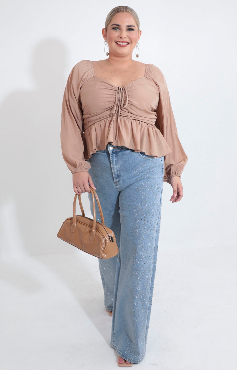 Esta blusa beige con peplum presenta manga larga y un escote cuadrado que aporta un toque elegante. Su diseño incluye un fruncido elástico en la espalda, ofreciendo comodidad y un ajuste perfecto. Ideal para otoño 2025, combina suavidad al tacto con un estilo sofisticado para cualquier ocasión.