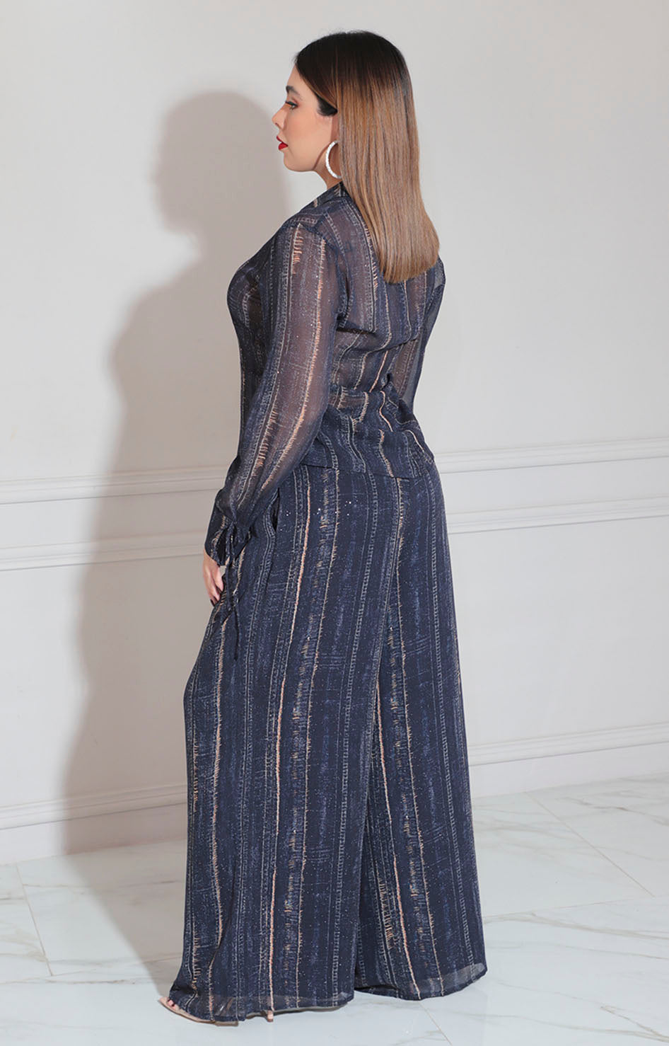 Conjunto azul marino confeccionado en tela suave que proporciona comodidad durante todo el día. La blusa estilo camisero ofrece un corte clásico y versátil, perfecta para crear looks sofisticados tanto en contextos profesionales como casuales. El pantalón recto complementa el diseño con líneas limpias y favorecedoras. El estampado en líneas doradas y azul añade un toque de elegancia y movimiento visual al conjunto, creando una propuesta moderna que trasciende las tendencias pasajeras. Una opción versátil para quienes buscan prendas de calidad que combinen estilo y practicidad.