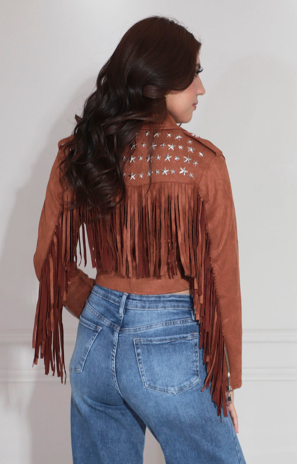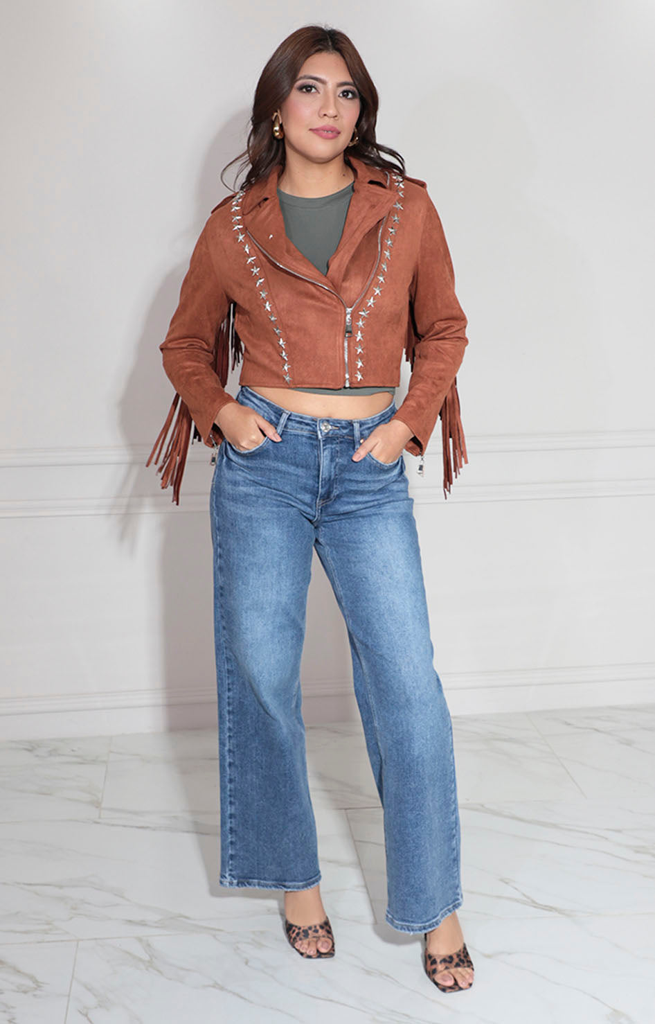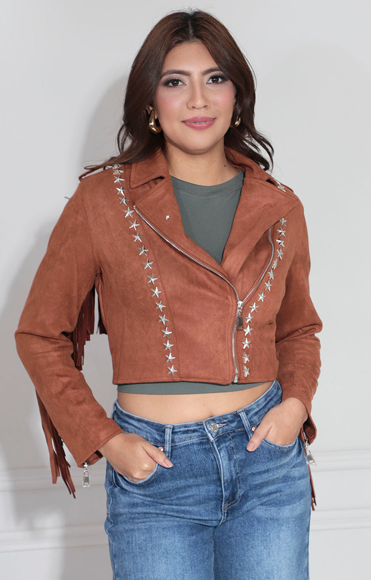 Chamarra de gamuza con textura chedrón que combina comodidad y estilo. Confeccionada en tela suave al tacto, cuenta con mangas largas que proporcionan cobertura completa. Destaca por sus flecos decorativos en la zona de espalda que añaden movimiento y personalidad. Los estoperoles en forma de estrellas crean detalles visuales únicos, mientras que el cierre metálico frontal garantiza funcionalidad y durabilidad. Una pieza versátil ideal para crear looks sofisticados con carácter.