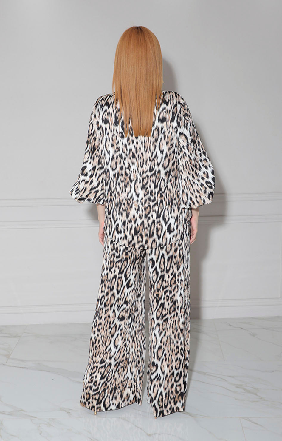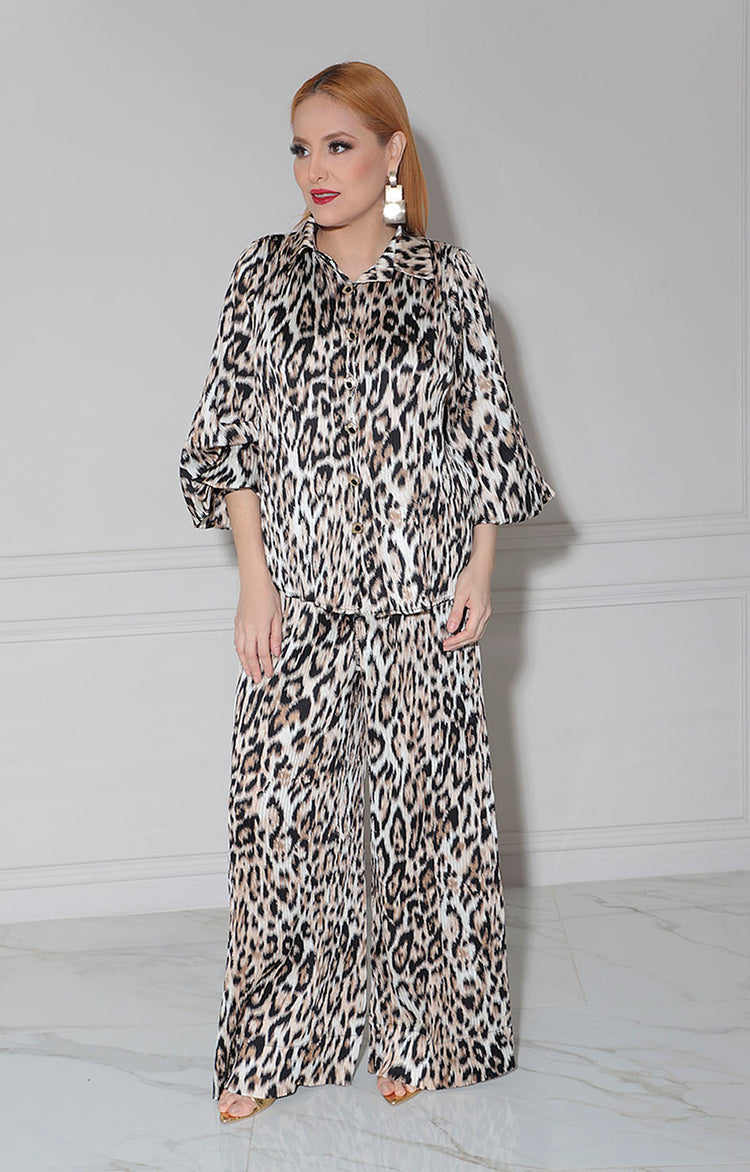 Conjunto versátil compuesto por blusa de manga larga con botones funcionales y pantalón a juego, ambas piezas lucen un estampado print contemporáneo. Diseñado para quienes buscan coherencia estilística sin sacrificar comodidad. La blusa ofrece estructura y elegancia gracias a sus mangas extendidas y cierre de botones, mientras que el pantalón complementa perfectamente la propuesta. Ideal para transiciones de estación y ocasiones que demandan un look pulido y coordinado.
