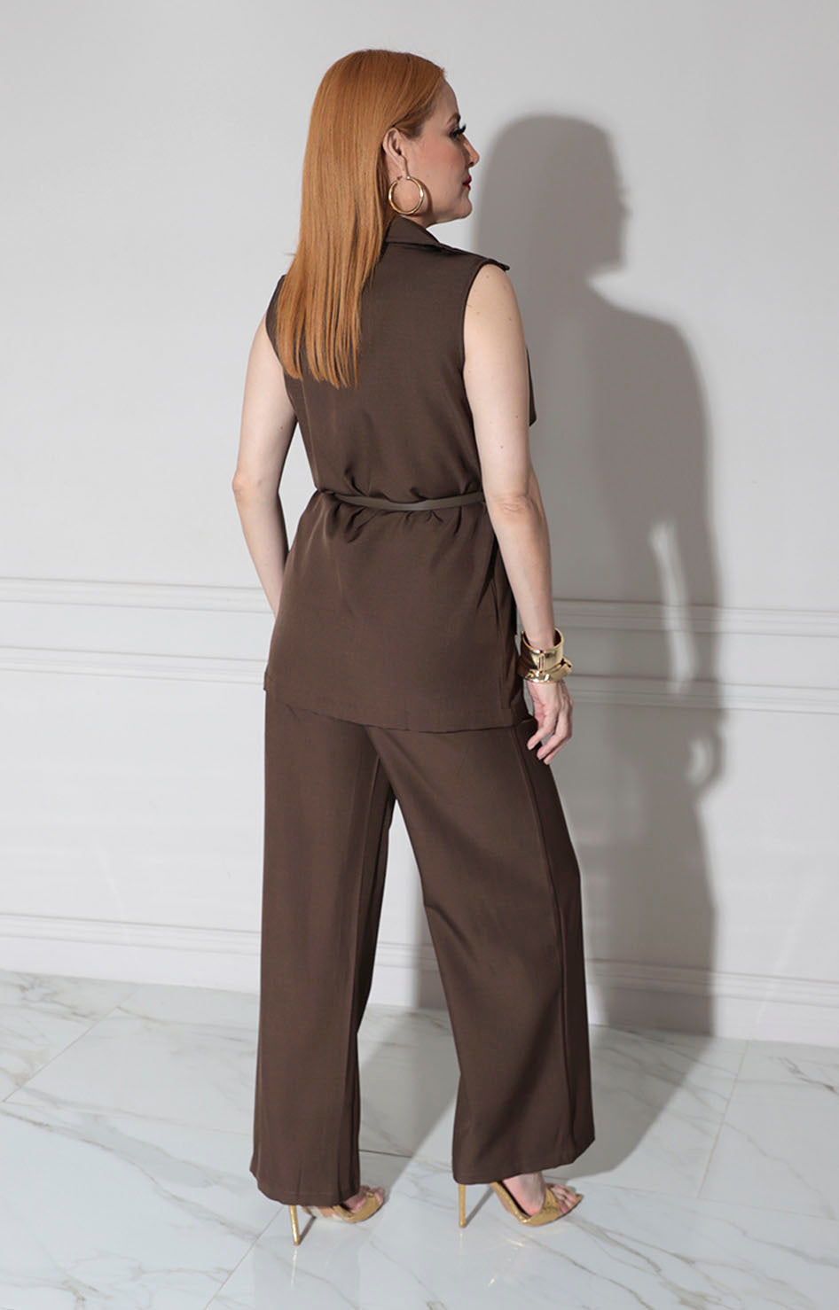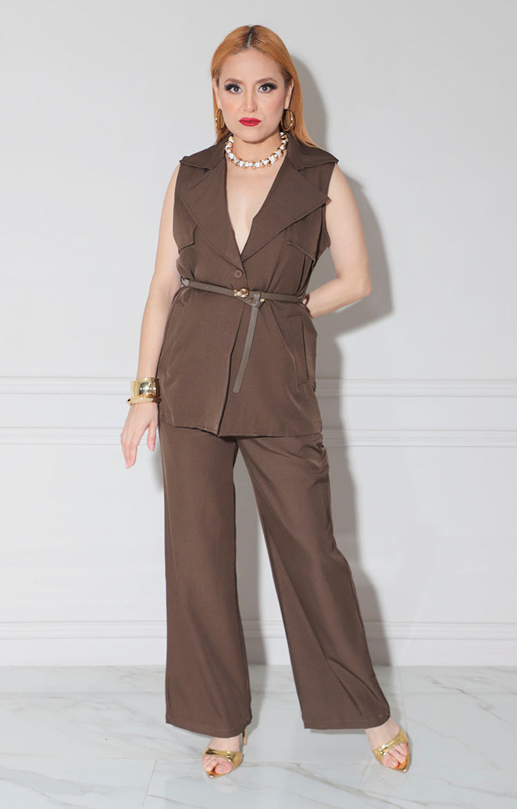 Conjunto café confeccionado en tela suave que proporciona comodidad durante todo el día. Incluye una blusa con estilo chaleco que añade elegancia y versatilidad a tu guardarropa, permitiéndote crear múltiples combinaciones. Complementa el look con un pantalón recto de corte clásico que favorece la silueta y se adapta a cualquier ocasión, desde casual hasta semiformal. Una opción sofisticada para quienes buscan prendas de calidad que combinen estilo y practicidad.