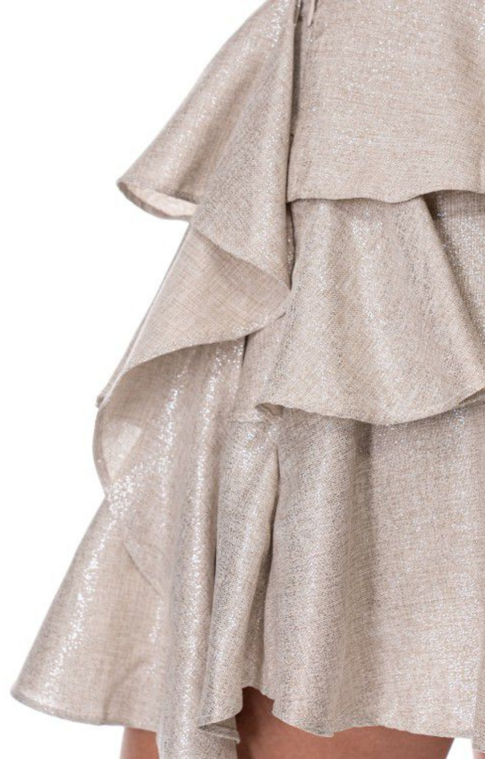 Falda mini confeccionada en tela metalizada de alta calidad que refleja luz con elegancia. Su corte ajustado y largo mini la convierten en una pieza versátil para ocasiones especiales, salidas nocturnas o looks contemporáneos. El acabado metalizado proporciona un efecto visual sofisticado que destaca en cualquier conjunto. Perfecta para quienes buscan prendas con presencia y estilo moderno. Combínala con tops neutrales o accesorios minimalistas para un look equilibrado.