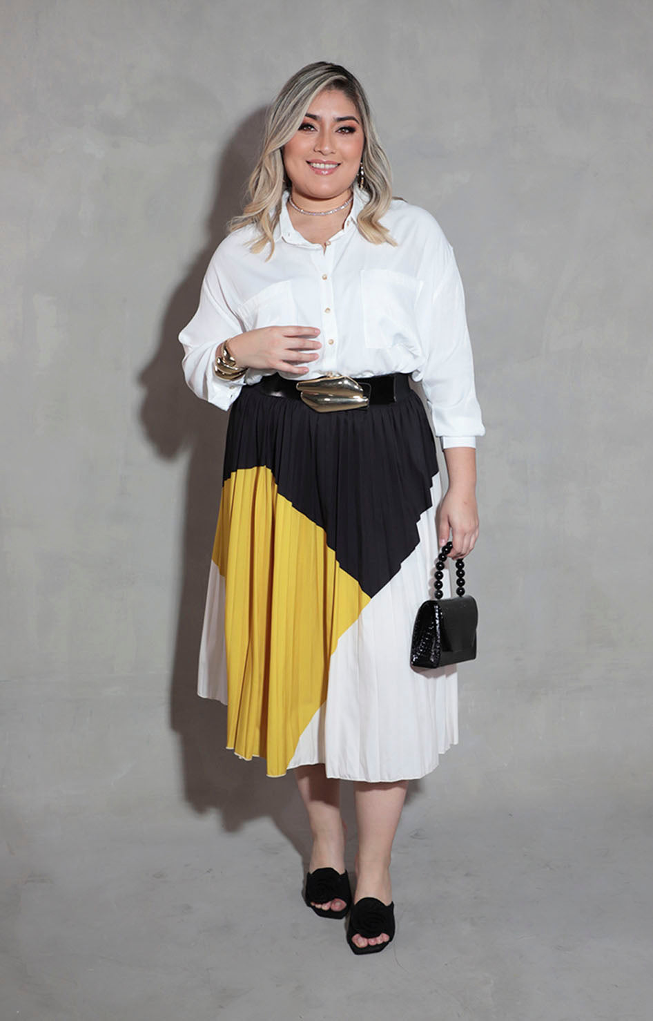 Esta falda negra plisada ofrece un diseño circular elegante, realzado por un resorte en la pretina que garantiza comodidad y ajuste perfecto. Su combinación de tres bloques de color en tonos beige, negro y amarillo aporta un toque sofisticado y versátil, mientras que la textura suave al tacto asegura una sensación agradable al usarla. Ideal para quienes buscan estilo y confort en una sola prenda.